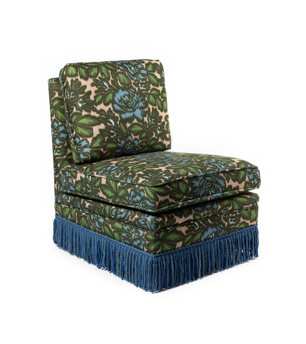 Custom-made in Spain, this swivel slipper chair adapts to any setting — whether in a bedroom, office, or living room, on its own or as a pair. Available with or without fringe, it can be upholstered in the fabric of your choice.