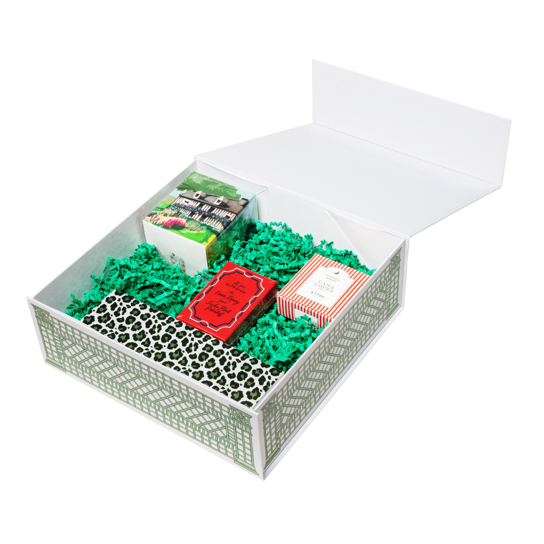 A gift set to give or to keep, featuring a Cottage scented candle, a Kyphi soap, an illustrated card deck, and a leopard matchbox. A warm, easy-to-love Christmas gift!