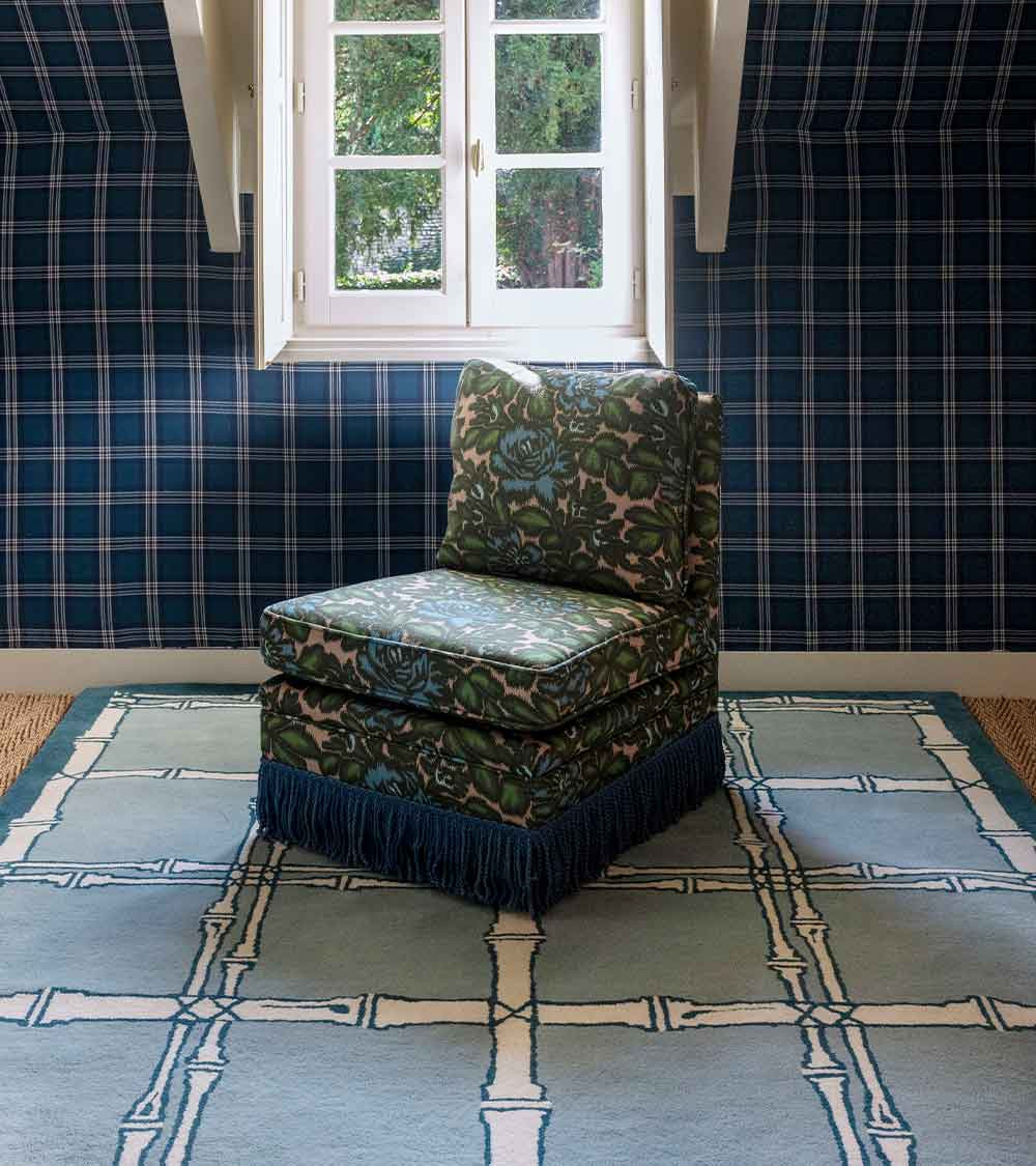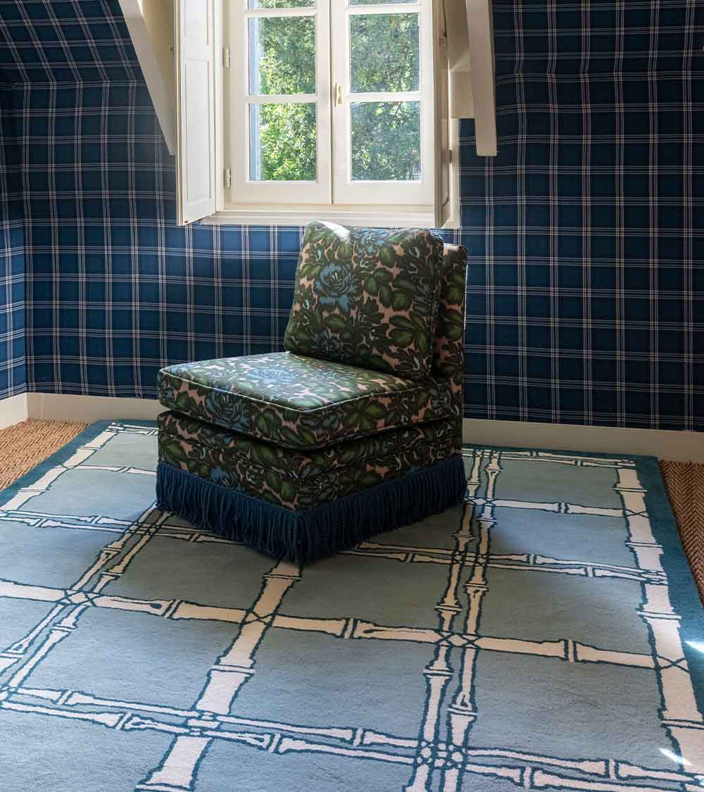 This 100% wool rug is inspired by the bamboo motif, which is elegantly worked into a delightful grid pattern. This carpet on an almond green background can be made to order in different sizes and colours. A successful evocation of the Far Eastern inspired carved wooden furniture that was in fashion at the end of the 19th century and in the 1970's, this carpet promises to be a great addition to many interiors, bringing a delicate touch of exoticism.