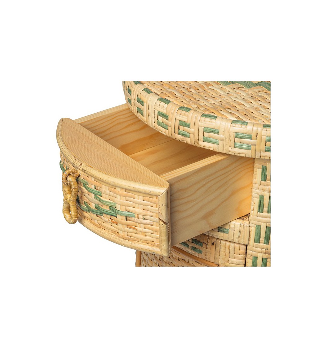 This adorable little bicolor side table in braided straw is entirely curved on the front and flat at the back. Handmade in Spain, it makes the perfect nightstand as it has a double storage space (a drawer and a cupboard). This piece of furniture helps to create a deliciously nomadic atmosphere to an attic room, but could also be used as a side table in the living room.