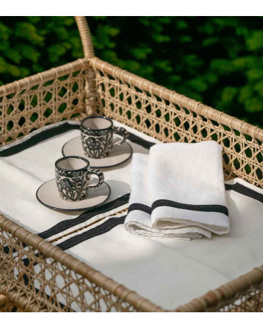 Casa Lopez's iconic collection, recognizable by its Hispanic-inspired motif - the bird nestled in a plant interlace - has been enriched with cups. These ceramic essentials, entirely hand-painted, are offered in four colors: red, black, blue and green-blue. Always on a cream background. You can choose to match them or mix and match, so that everyone has their own, even if it means swapping saucers.