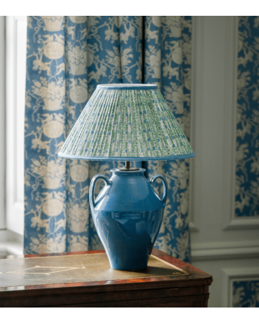Avec leurs pieds en forme de jarre parée de chaque côté de belles anses, ces grandes lampes en terre vernissée à la main existent en une seule taille et plusieurs coloris. Coiffées d’un abat-jour froncé, elles s’imposent à la manière d’une pièce chic et forte dans une maison de campagne contribuant à y inscrire un parti-pris décoratif.