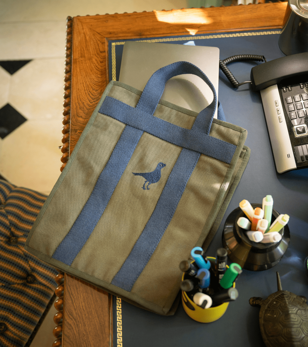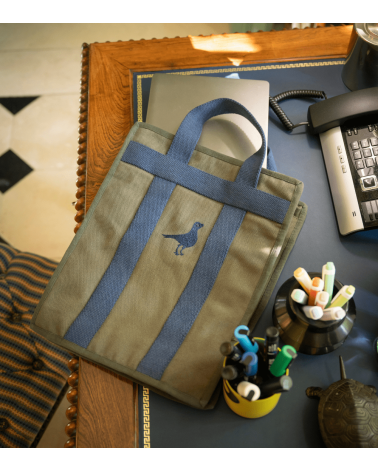 Confectionné dans une toile ultra résistante, d’un gris tirant sur le kaki, ce sac à documents, tenu et structuré par des sangles robustes, bleu lapis, et équipé de poches intérieures, a été imaginé par Pierre Sauvage comme un accessoire indispensable pour porter ses essentiels. Ni trop grand, ni trop petit, d’une forme plutôt rectangulaire pour bien y accueillir la presse, un iPad, une bouteille d’eau et des dossiers, il convient aussi bien à la vie en ville qu’en voyage. Brodé d’un oiseau, symbole iconique de la maison depuis que celui niché dans les entrelacs végétaux des céramiques est devenu un classique, se sac pratique et élégant promet d’être bientôt un incontournable.