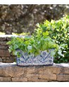 Entièrement peinte à la main dans des harmonies bleu lapis et vert tendre sur fond gris blanc, cette jardinière ornée du désormais iconique motif de Casa Lopez, l’oiseau niché dans un entrelac végétal, est jolie dedans comme dehors. A l’intérieur d’une cuisine, on y plante ses plantes aromatiques; sur une terrasse, on la garnit volontiers de fleurs de saison.