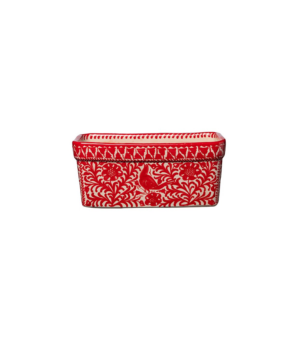 Entièrement peinte à la main dans des harmonies bleu lapis et vert tendre sur fond gris blanc, cette jardinière ornée du désormais iconique motif de Casa Lopez, l’oiseau niché dans un entrelac végétal, est jolie dedans comme dehors. A l’intérieur d’une cuisine, on y plante ses plantes aromatiques; sur une terrasse, on la garnit volontiers de fleurs de saison.
