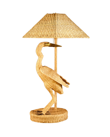 Cette lampe en jacinthe d'eau, entièrement réalisée à la main, se pose avec élégance sur une table ou un bureau. Parfaitement dessiné, cet élégant héron apporte à toutes les pièces qu’il éclaire une note d’exotisme toujours raffinée. Son bec, en laiton, ajoute une touche de contraste subtile et précieuse à la texture naturelle du tressage.