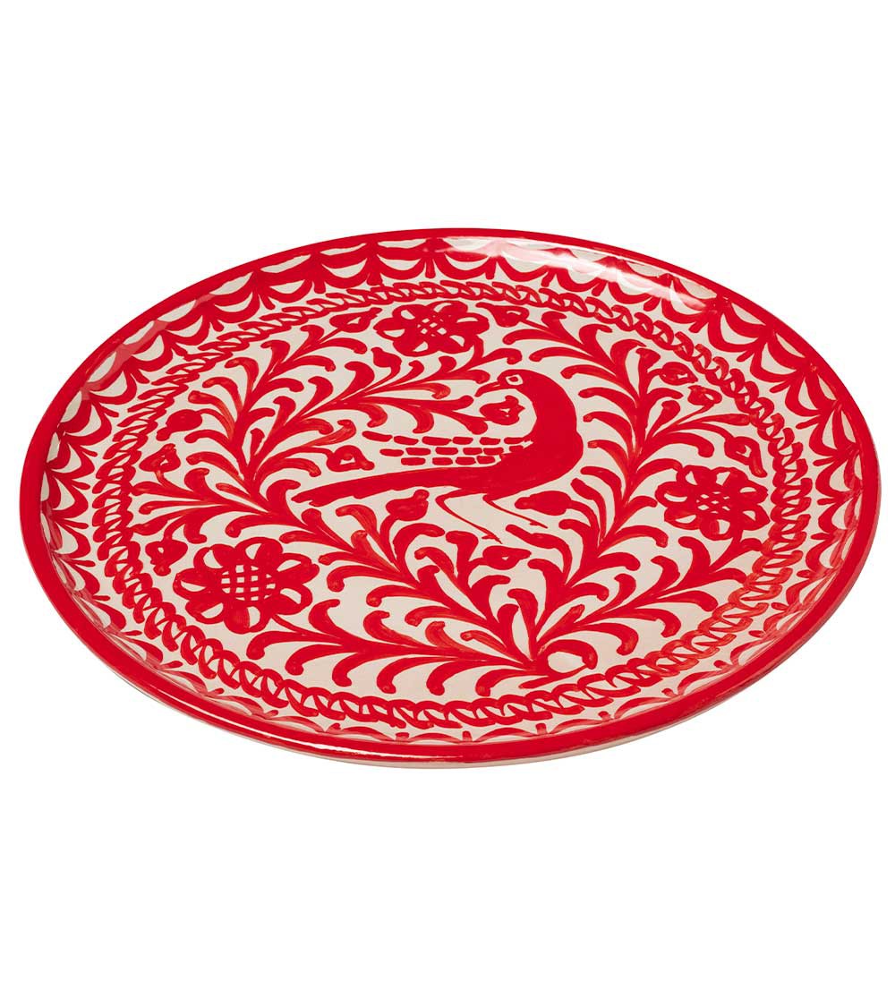 Cet incontournable de la table vient rejoindre une collection emblématique de chez Casa Lopez, Les Oiseaux, identifiable à son motif végétal qui laisse apparaître un oiseau niché parmi des feuilles et feuillages. Le plat à tarte, avec son fond plat et ses rebords en pente douce, existe en trois versions : vert et bleu, rouge, noir, sur fond blanc. En faïence, entièrement peint à la main, il fera des merveilles sur le chariot des desserts et la joie des gourmands.