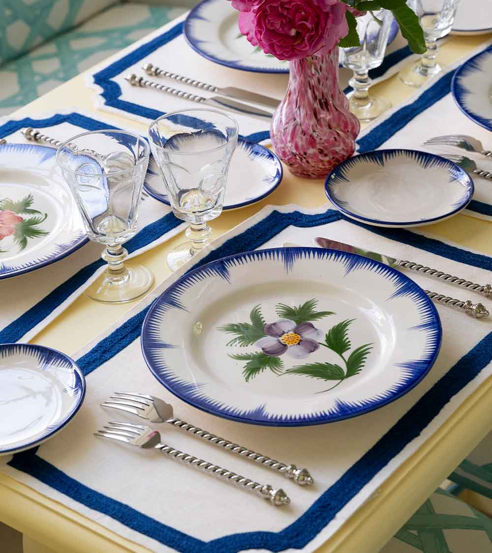 « Ce rosier rugueux, simple et odorant me ferait presque penser à une fleur des champs ». C’est pour rendre hommage à cette espèce qu’il affectionne tout particulièrement que Pierre Sauvage a imaginé le service Rugosa. Ces assiettes en céramique peintes à la main sont décorées d’un pourtour peigné bleu dur, inspiré du célèbre service en faïence XIXème Rousseau. Décorées en leur centre d’un délicat dessin de rose, noire, bleue ou rose, adossé à une branche ornée de feuillage, elles existent en trois tailles : assiettes à dîner, à dessert et à pain. Ce service de famille par excellence est facile à utiliser que l’on dîne à la cuisine ou dans la salle à manger. Il s’assortit à toutes sortes de verres, blancs, bleus ou choisis aux couleurs des roses. Et marque l’entrée d’une nouvelle fleur dans les collections Casa Lopez.