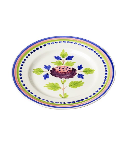 Deux charmants motifs pour une assiette en céramique peinte à la main qui mêle les tonalités de bleu, vert, mauve et rose. L’artichaut, chardon printanier magique car comestible est ici joliment stylisé pour occuper l’espace des assiettes de présentation; les châtaignes, délicieux fruits de l'automne abritées de bogues à piquants, se regroupent par quatre pour habiller avec charme le fond d’une assiette au contour multicolore. Ce service comporte des assiettes à dessert blanches au pourtour orné de traits et collier de points choisis dans des camaïeux de couleurs. Se mélangeant les unes aux autres, toutes apportent une élégance teintée de fraicheur et de fantaisie aux tables d’été comme à celles d’hiver. Campagne ou ville, ce sera selon les circonstances et l’état d’esprit du moment.