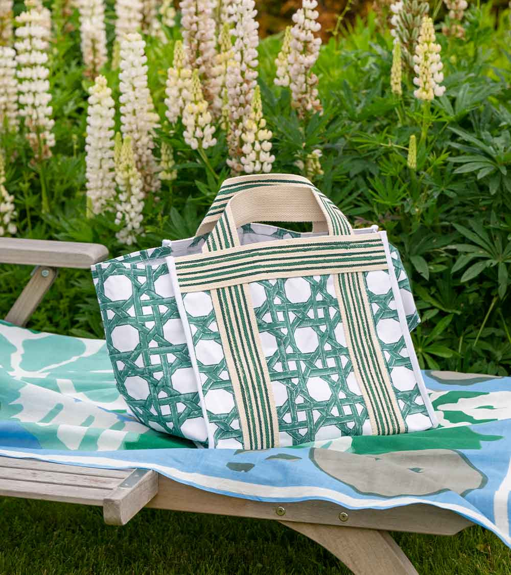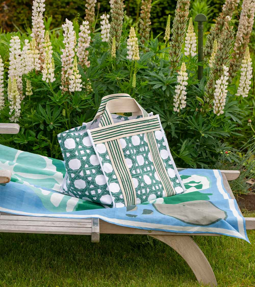 Ces grands sacs chics et pratiques s’habillent cette saison du fameux motif cannage. Un classique de la maison qui évoque l’élégance des années 50, période à laquelle ce tressage du rotin à l’aspect régulier fût à son apogée, dans la mode comme la décoration. Thème désormais universel, ici imprimé au blockprint en rouge, vert, bleu, il confère une élégance tout terrain à ce sac de forme géometrique et généreuse, que l’on utilise aussi bien à la plage, la piscine, que pour faire son marché ou transporter des dossiers. Et même l’hiver, l’on en fera un bel usage pour y ranger ses revues, ou ses paréos, dans son dressing.