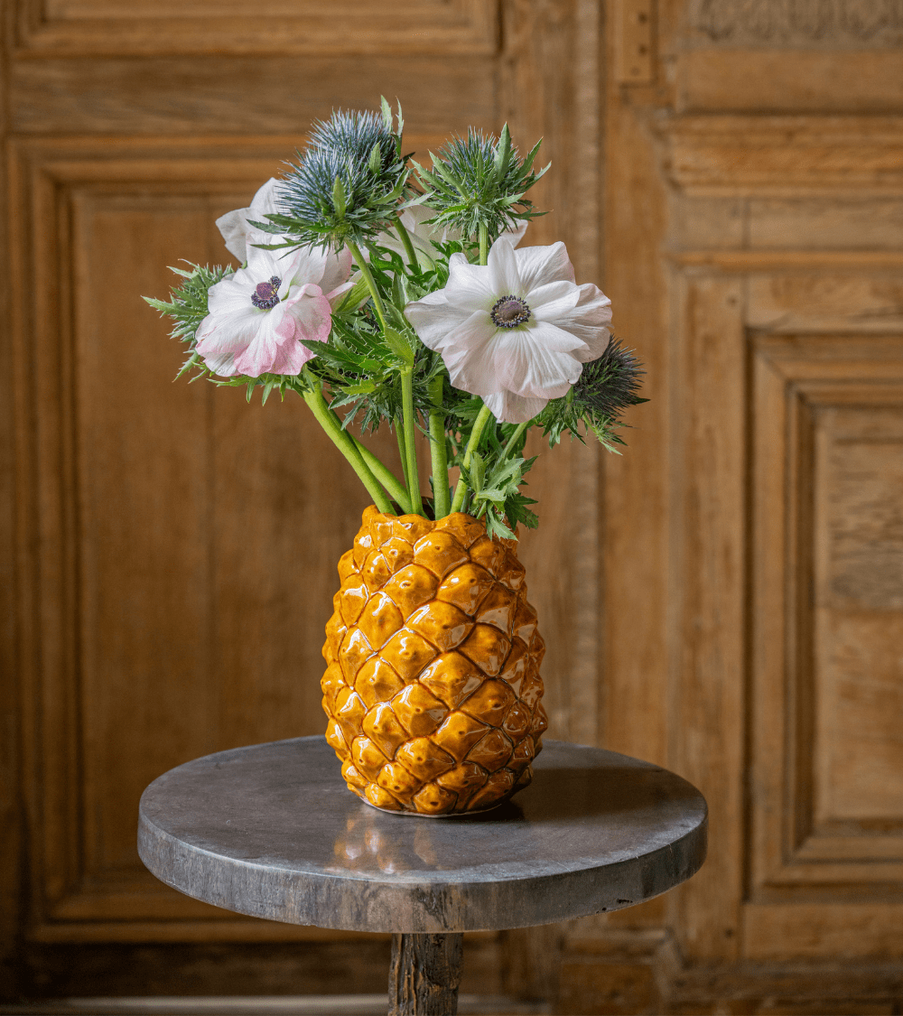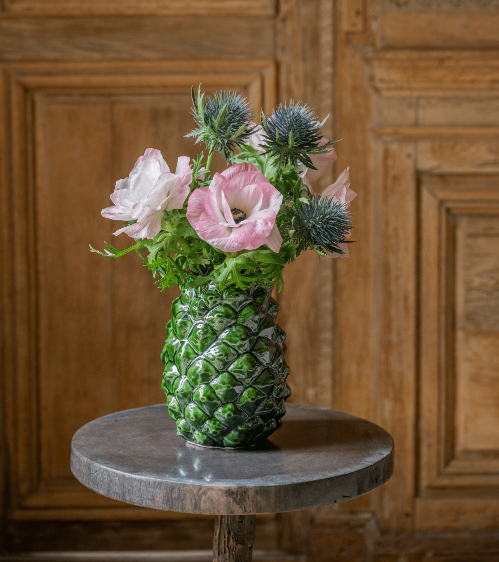 C’est la pomme de pin, fruit ou plutôt cône de l’arbre du même nom, symbole de fécondité et d’immortalité, qui a inspiré à Pierre Sauvage le vase Api. Ce contenant en terra cota vernissée est proposé en une seule taille et quatre déclinaisons de couleurs : uni vert ou ocre, ou les deux couleurs mêlées à dominante verte ou ocre. D’un volume parfait pour que s’y épanouissent fleurs et feuillages, il est de toutes les occasions. Dehors, pour accueillir quelques branchages du jardin, dedans, rempli ou vide, disposé par un ou plusieurs, il se métamorphose en centre de table, pot a ustensiles, objet tout simplement décoratif. On l’aime pour sa rondeur et son réalisme élégant.