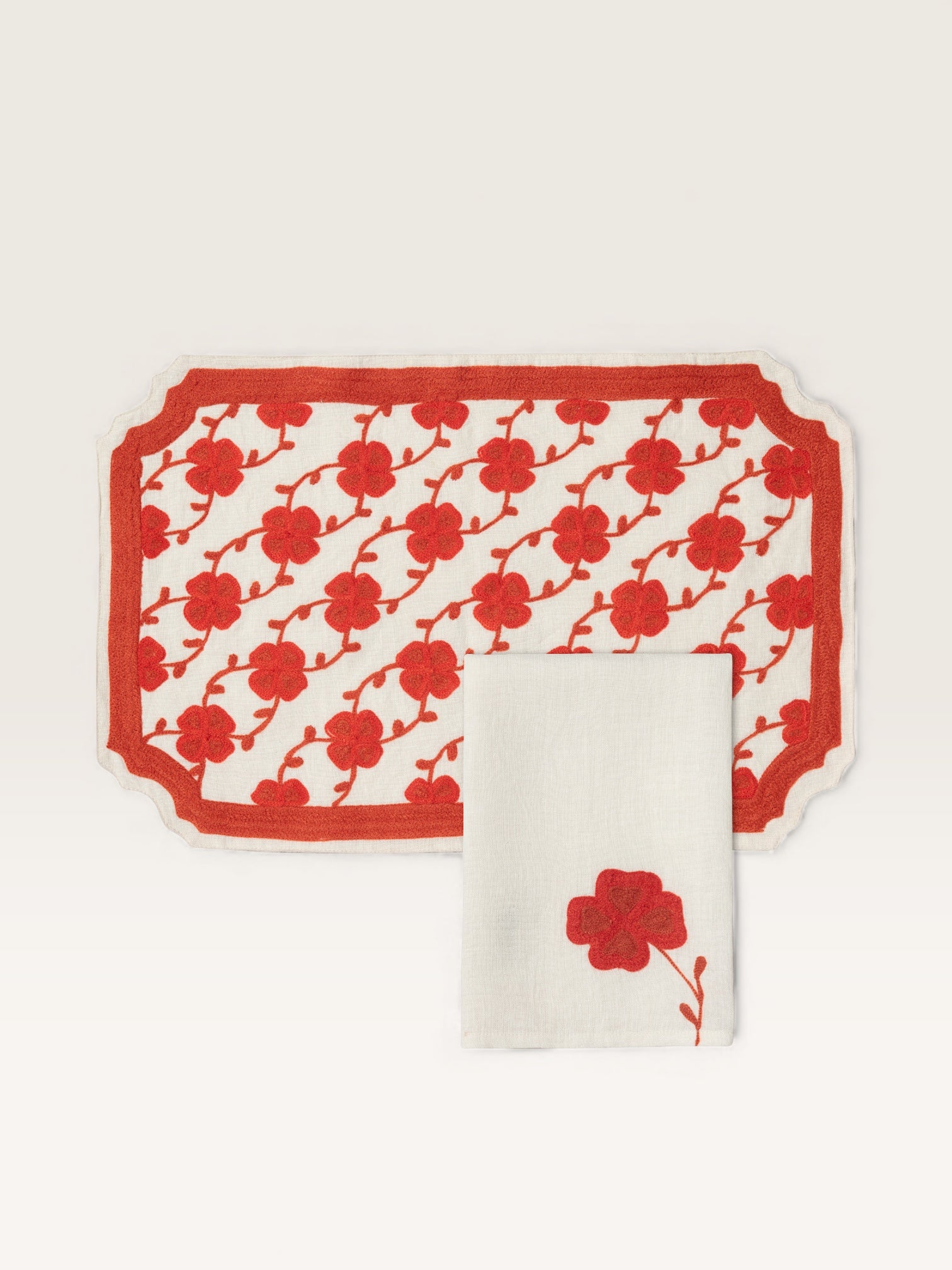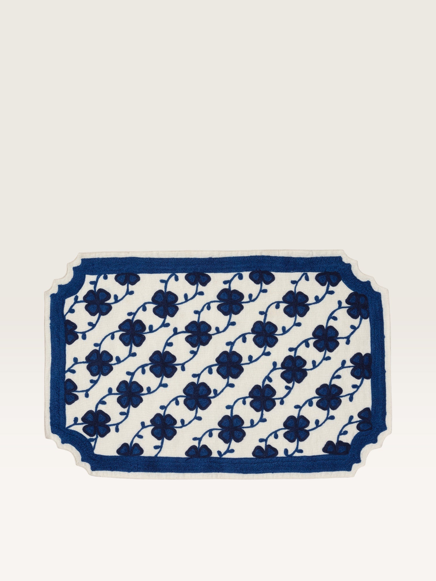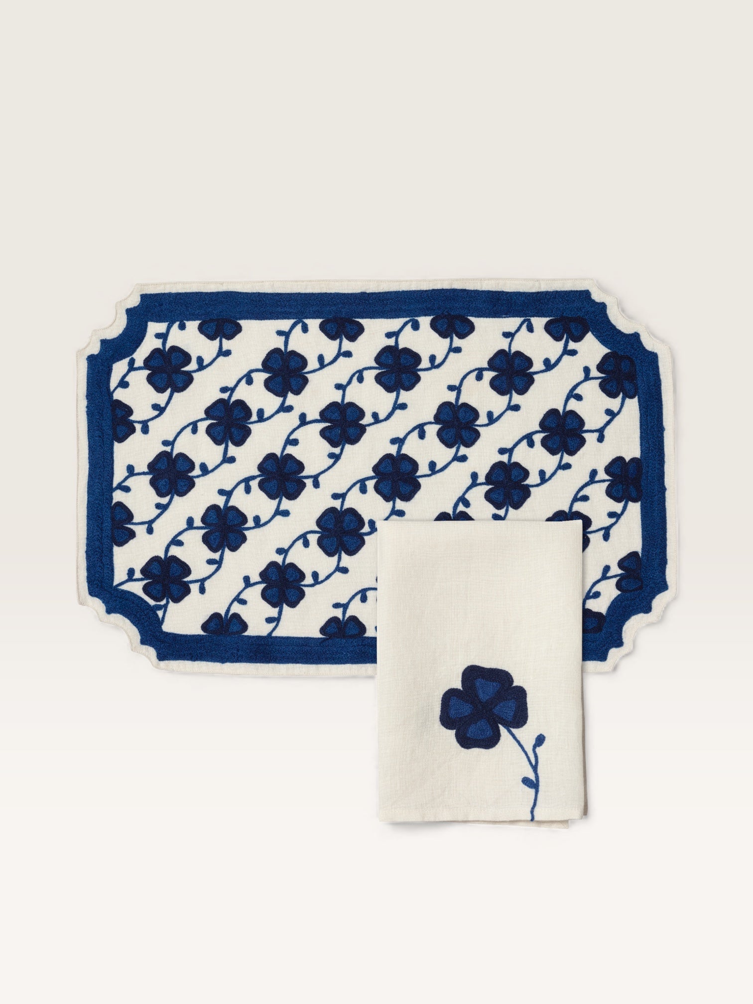 Ces sets de tables recouverts d’un semis de trèfles stylisés sont bordés d’un passe poil uni à la découpe d’esprit XVIIIè. En revisitant avec une grand liberté créative forme et Indiennes du siècle des Lumières, ils apportent aux tables où on les pose une exquise note d’élégance à la française. Proposés avec des serviettes unies où un trèfle trône en majesté, ils existent en trois coloris, bleu lapis, vert mousse et rouge cerise. On peut les mélanger à un service uni ou jouer la carte du mix and match avec des jeux de couleur à la Matisse.
