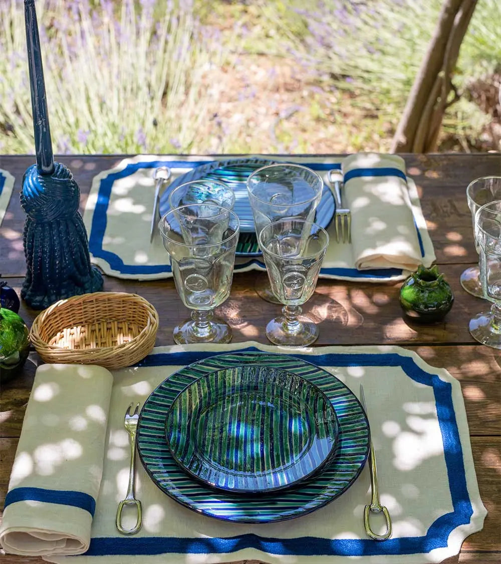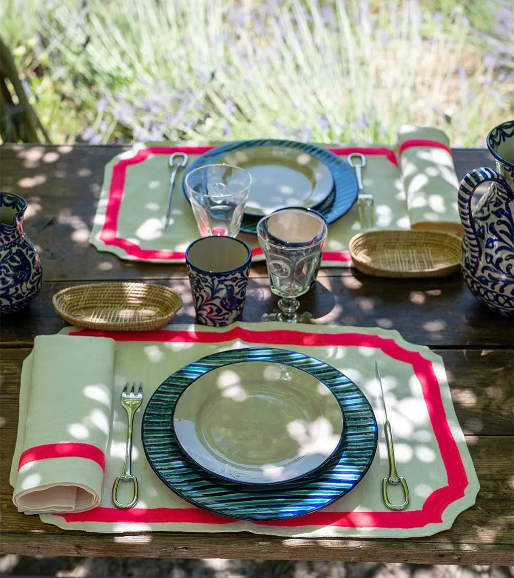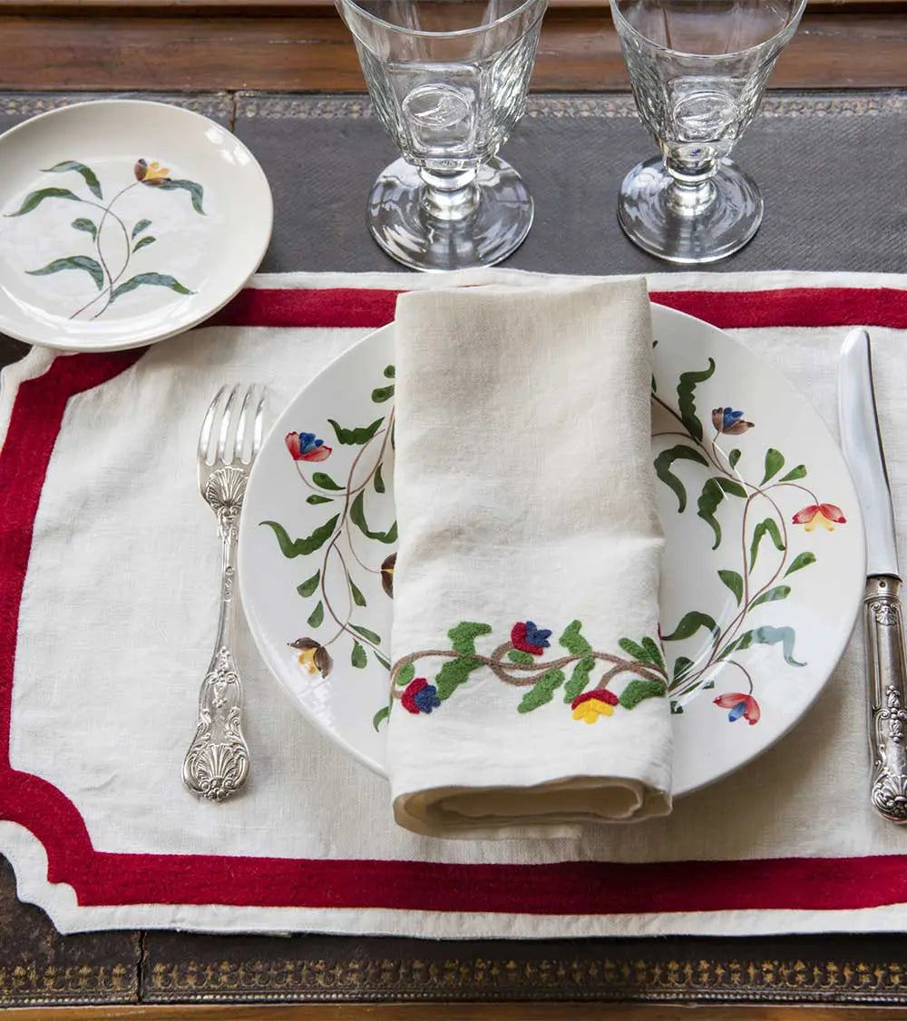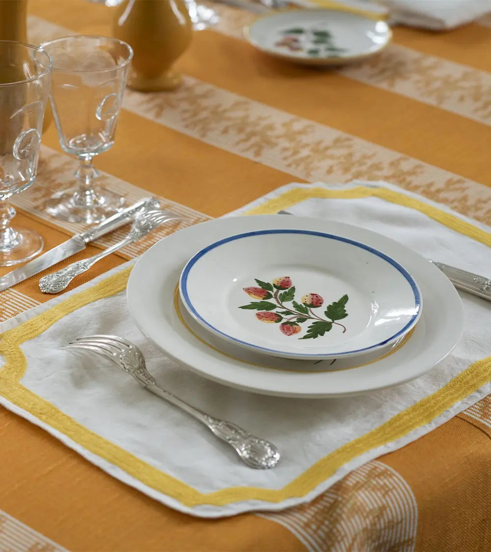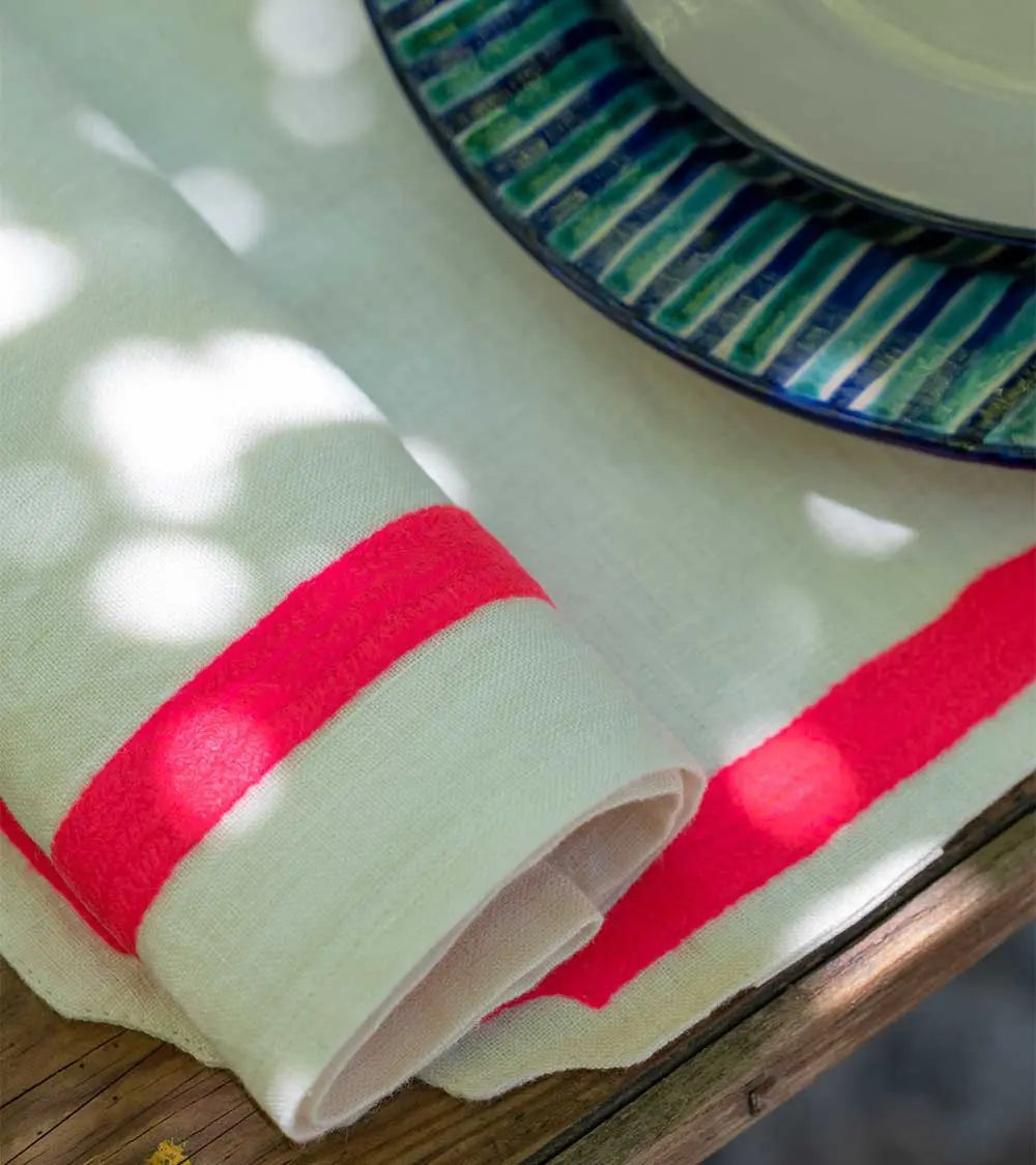 C’est la beauté du linge ancien et des draps lourds de nos grands-mères qui inspire cette collection de sets et serviettes de table brodés laine. Découpés dans un lin naturel magnifique, décorés d’un cadre marine ou rose fluo, ils sont accompagnés de larges serviettes brodées d’une ligne de couleur. On les choisit dans les deux tonalités pour les mélanger à l’envie. Et pour créer une ambiance de table contrastée, on les mixe à des assiettes motifs oiseaux noirs ou bleus.