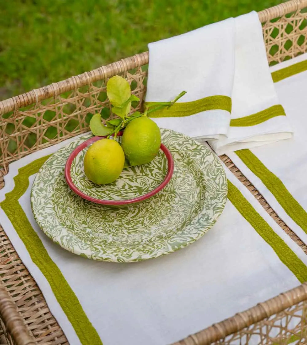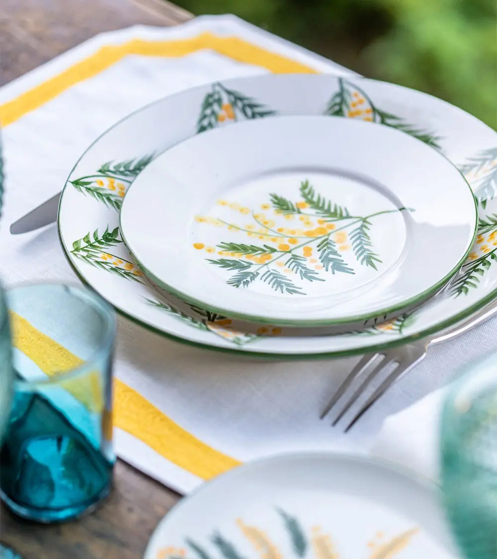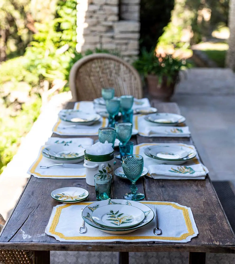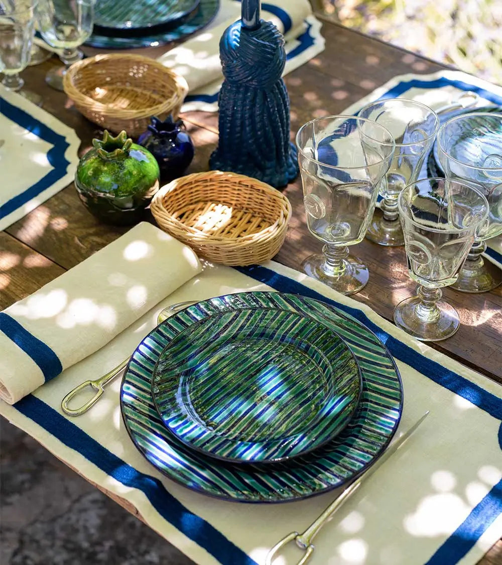 C’est la beauté du linge ancien et des draps lourds de nos grands-mères qui inspire cette collection de sets et serviettes de table brodés laine. Découpés dans un lin naturel magnifique, décorés d’un cadre marine ou rose fluo, ils sont accompagnés de larges serviettes brodées d’une ligne de couleur. On les choisit dans les deux tonalités pour les mélanger à l’envie. Et pour créer une ambiance de table contrastée, on les mixe à des assiettes motifs oiseaux noirs ou bleus.