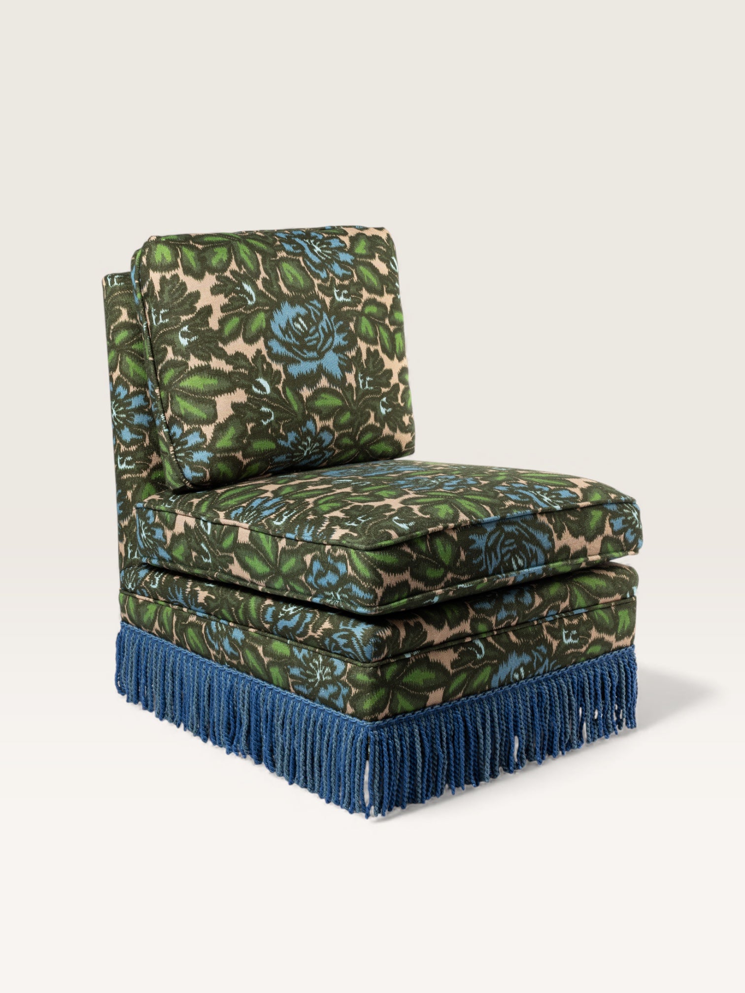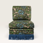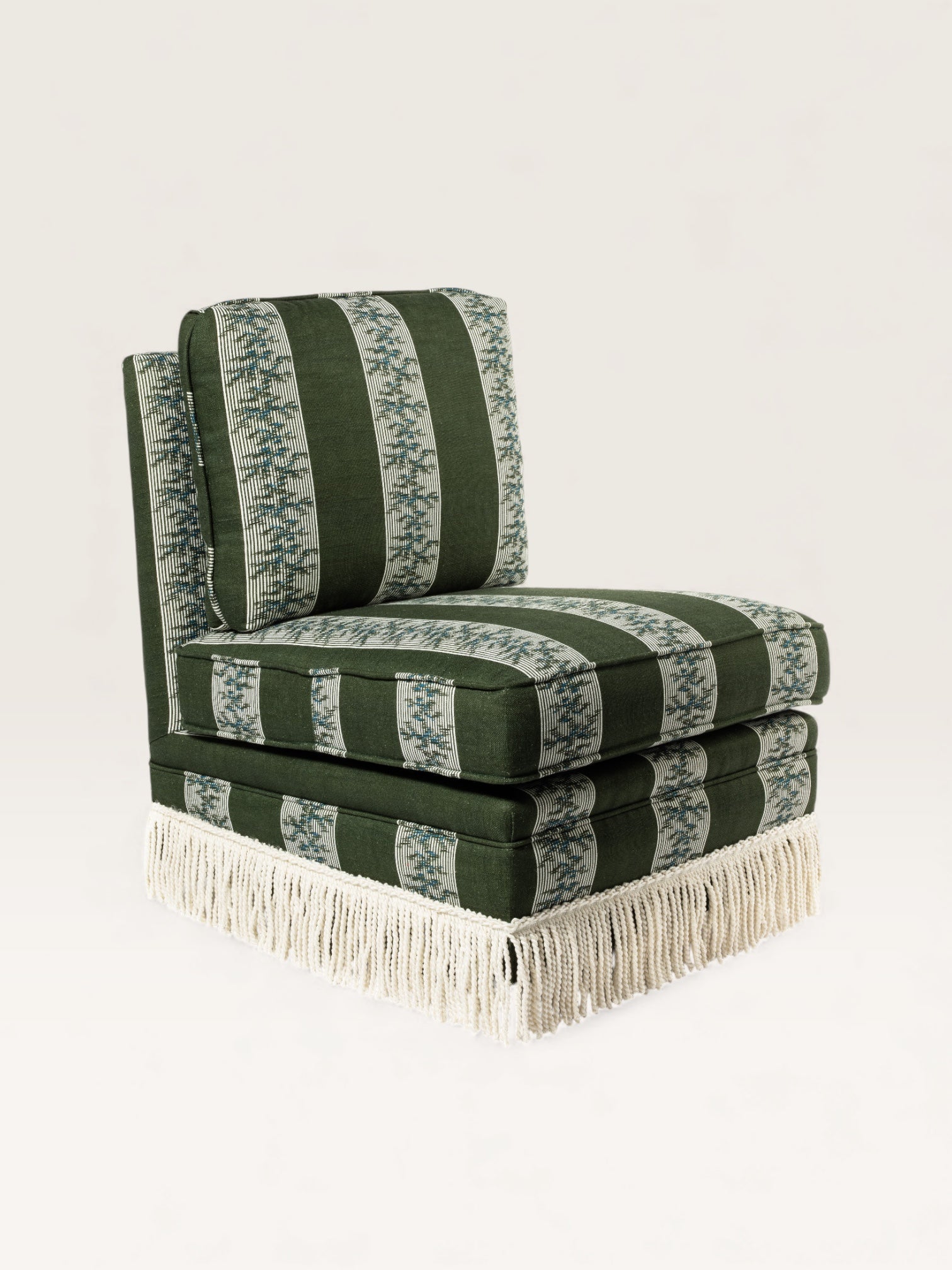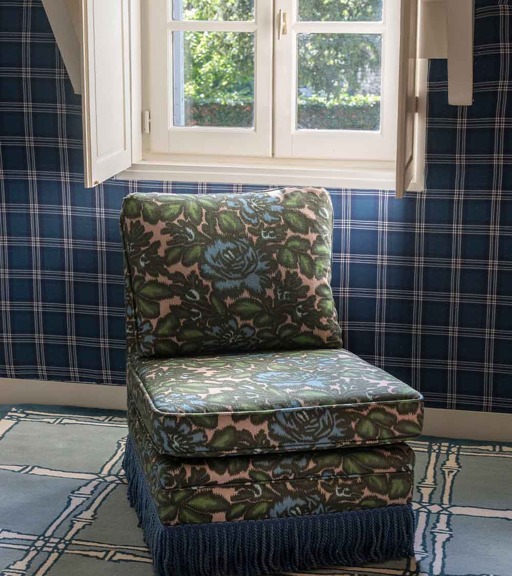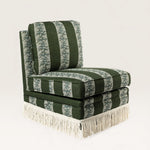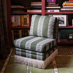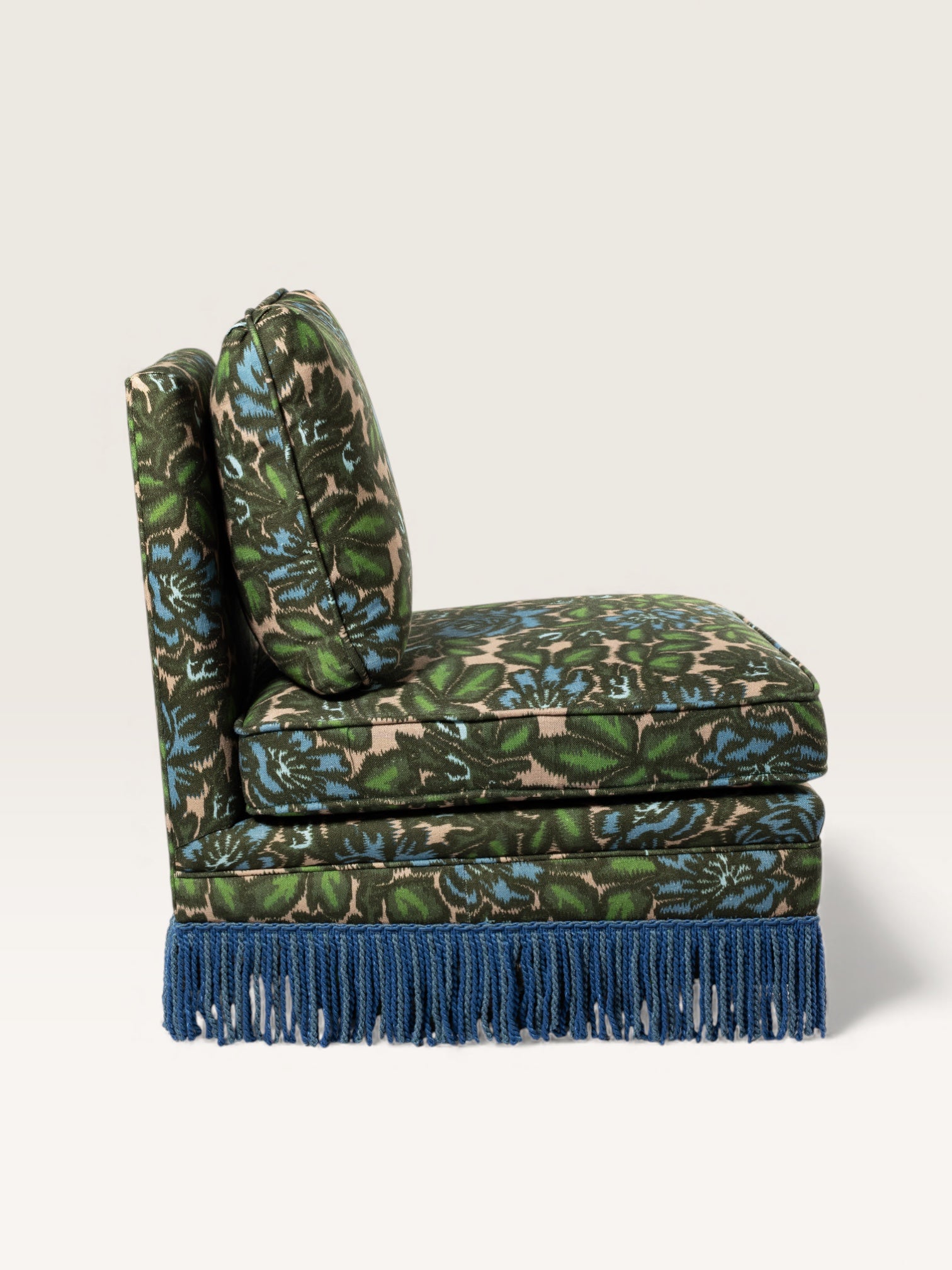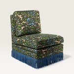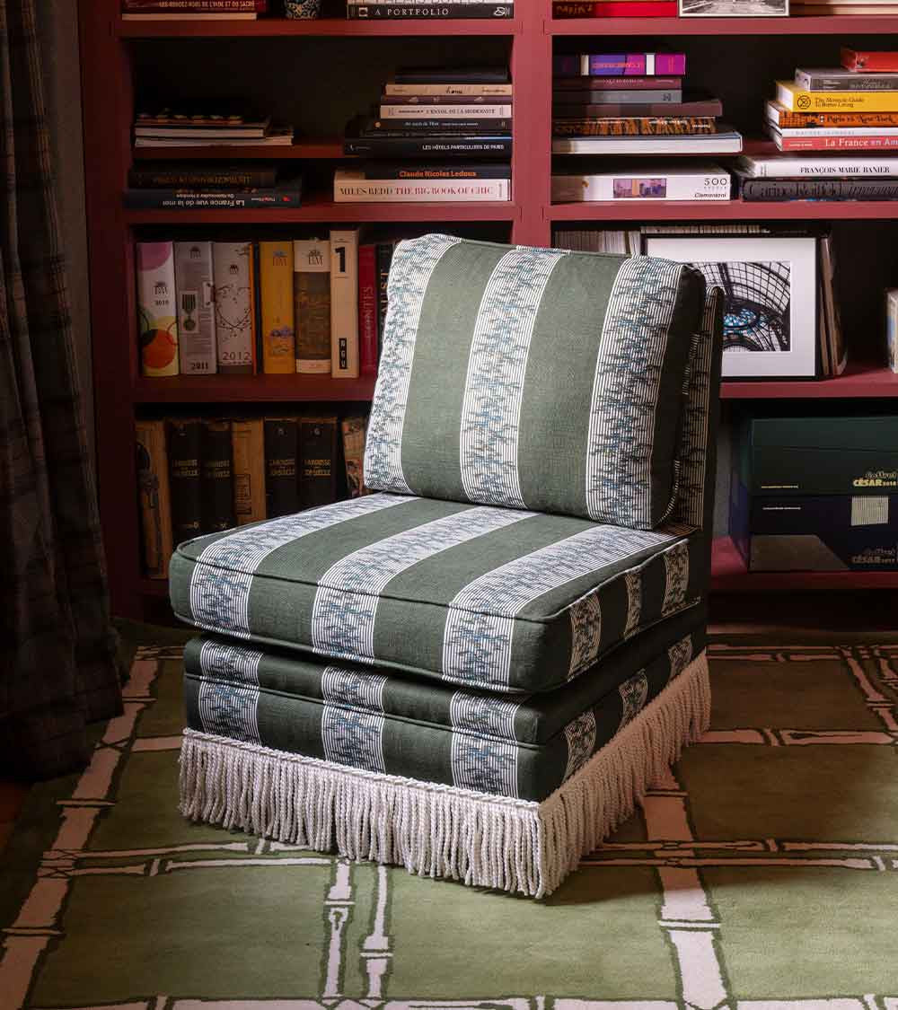 Fabriquée en Espagne sur mesure, cette chauffeuse pivotante s’adapte à toutes les occasions — dans une chambre, un bureau ou un salon, seule ou en duo. Avec ou sans franges, elle se commande dans le tissu de votre choix.