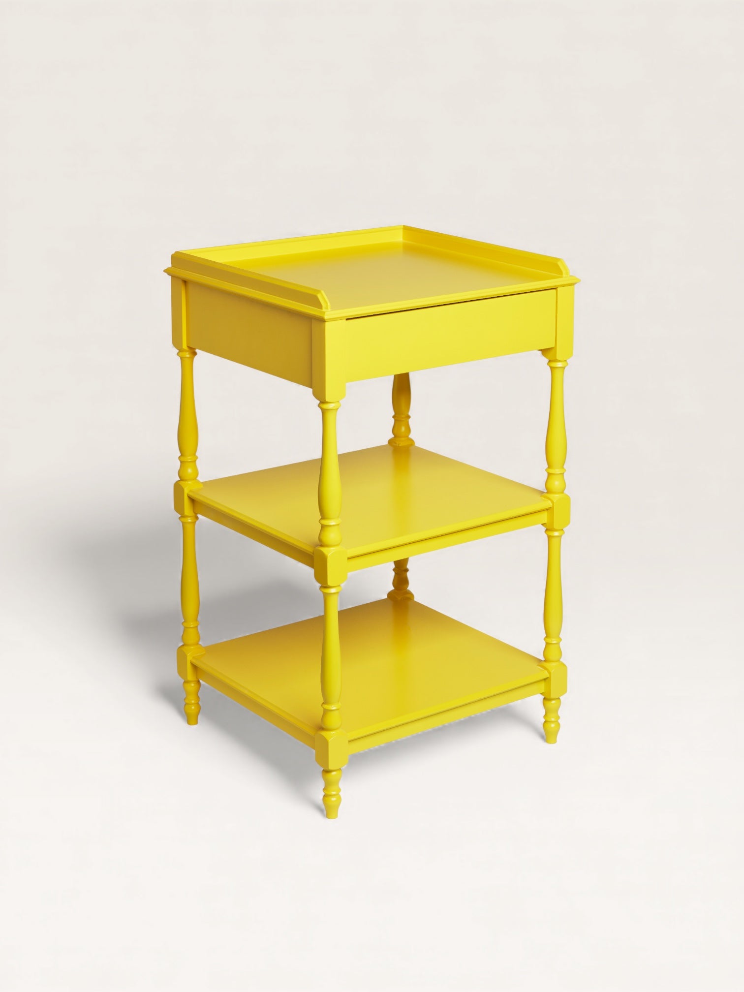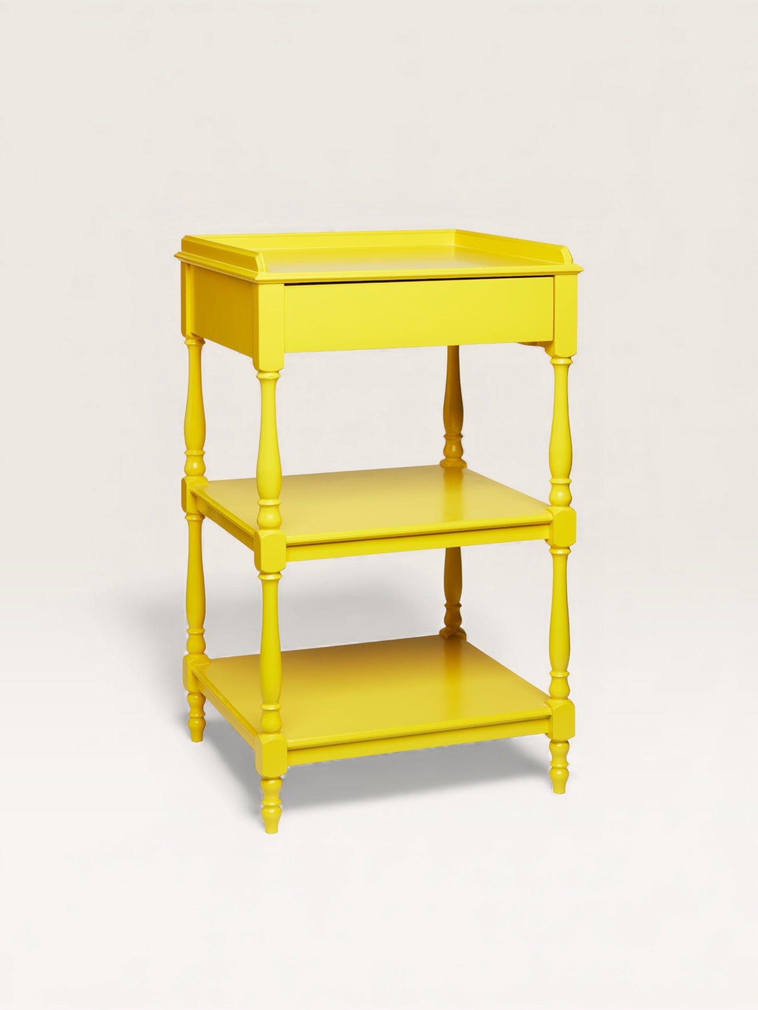 Le mot du créateur : Parfaites, avec leurs trois plateaux et leur tiroir, ces tables d’appoint en bois de couleur s’inspirent du mobilier classique pour mieux le détourner. Faciles à placer, en table de nuit ou bout de canapé. En collection, elles sont disponibles à vos couleurs sur commande.