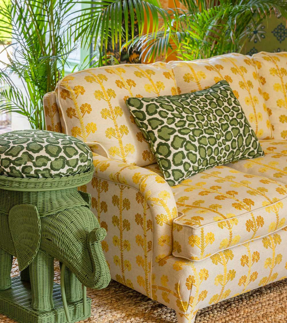 Motif panthère oversize, emblématique de Casa Lopez, revisité ici en broderie de laine bicolore sur un lin crème épais, ce tissu texturé est un véritable pelage textile. Il habille avec esprit et audace canapés, méridiennes, paravents ou rideaux.