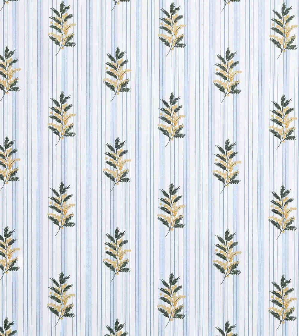 C'est sur un coton rayé que Casa Lopez a choisi de placer des bouquets de mimosa stylisés. Cette fleur jaune d'or, joyeuse et lumineuse, traitée ici en un motif regulier, apporte un contraste élégant à la géométrie du fond sur lequel elle se place. Proposés dans deux rayures plus ou moins espacées, ces tissus extrêmement frais s’imaginent montes en rideaux, couvre lits, têtes de lit… dans des chambres d'été prêtes à conserver en hiver leur esprit ensoleillé.