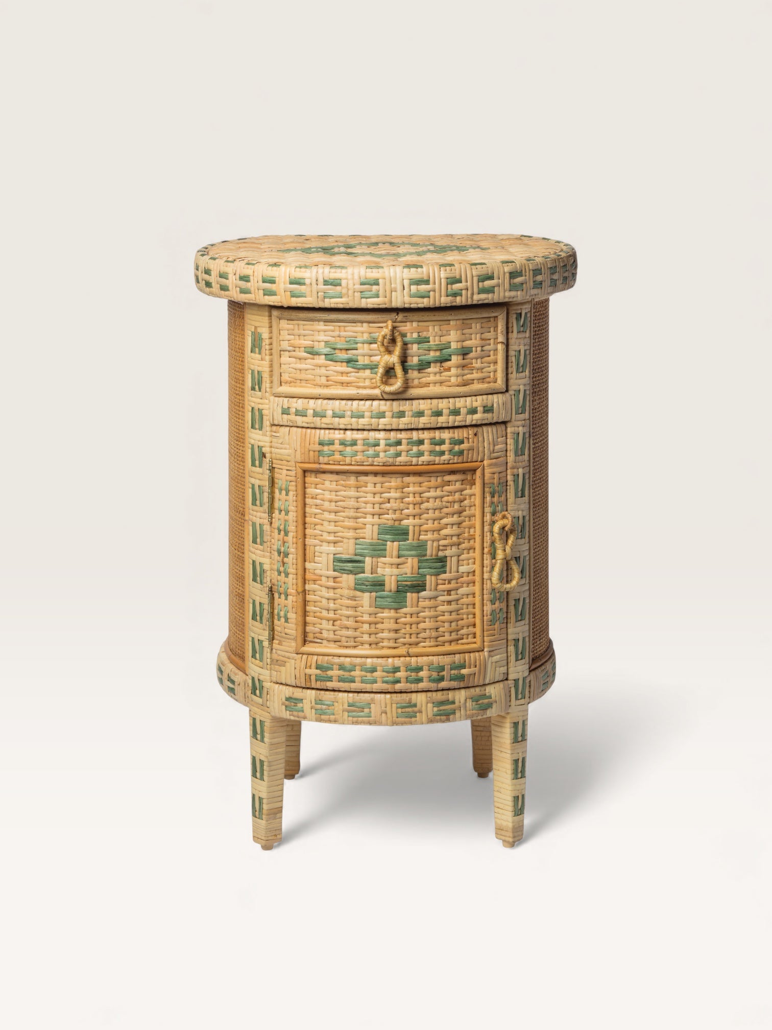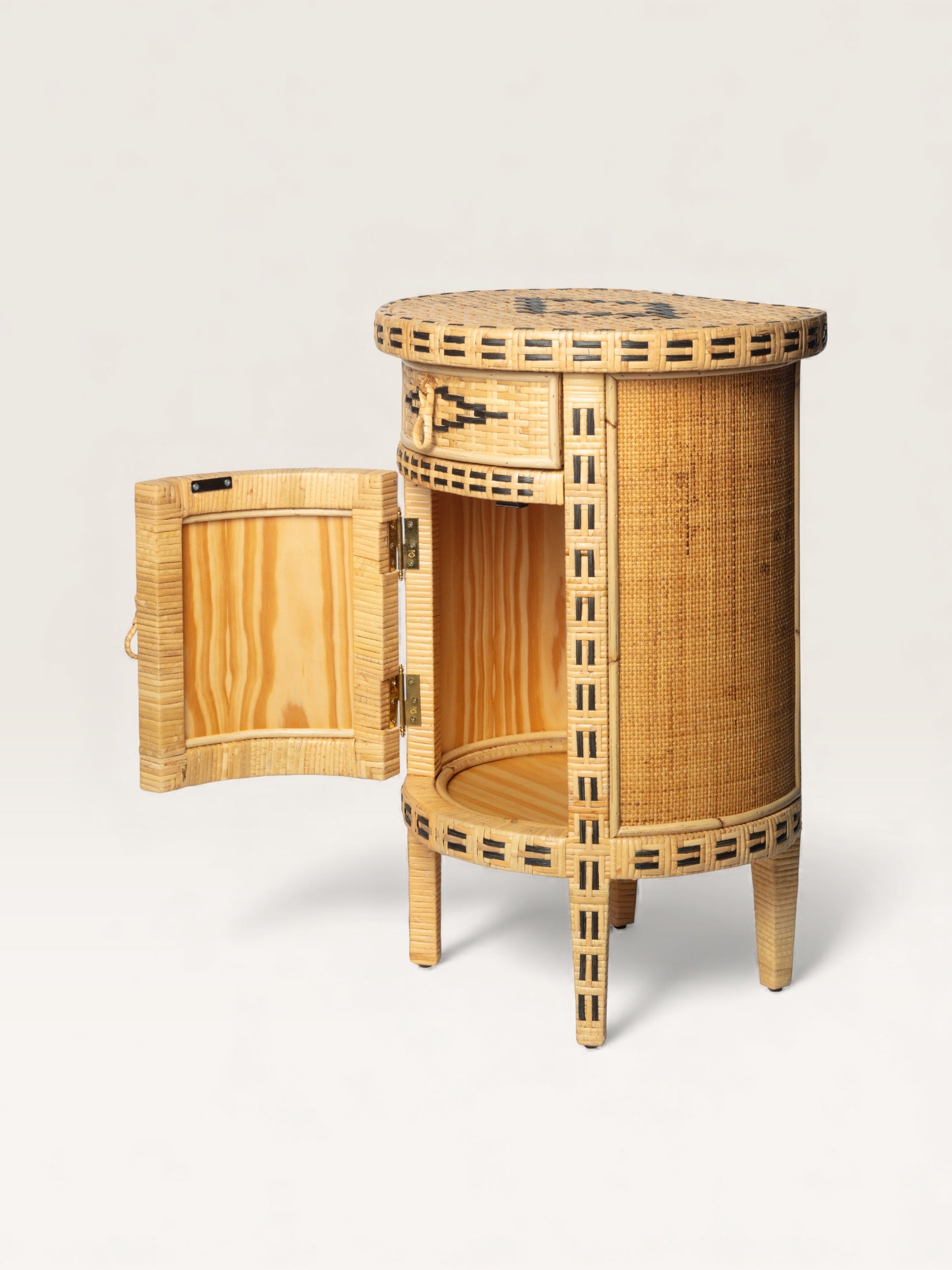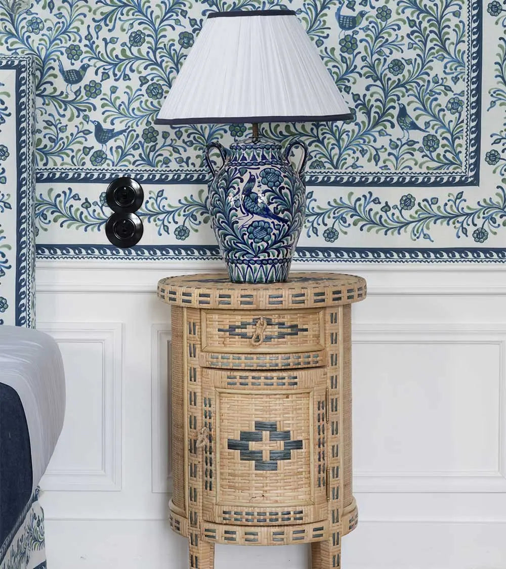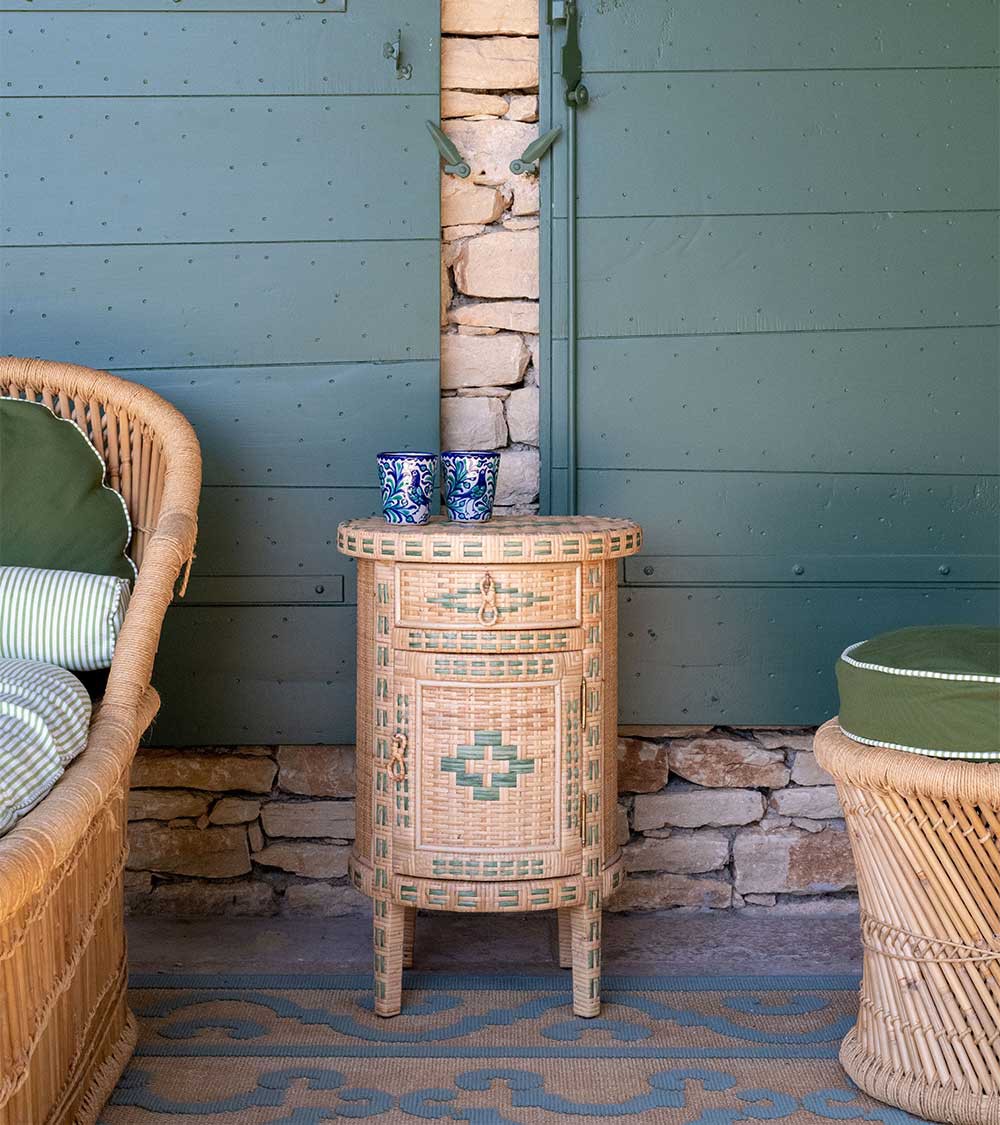 This adorable little side table, crafted from two-tone woven straw, is fully curved at the front and flat at the back. Handmade in Spain, it makes an ideal bedside table. Featuring two sets of storage—a drawer and a cupboard—it helps create a delightfully nomadic atmosphere in an attic bedroom but can also serve as a charming end table in a more traditional living room.