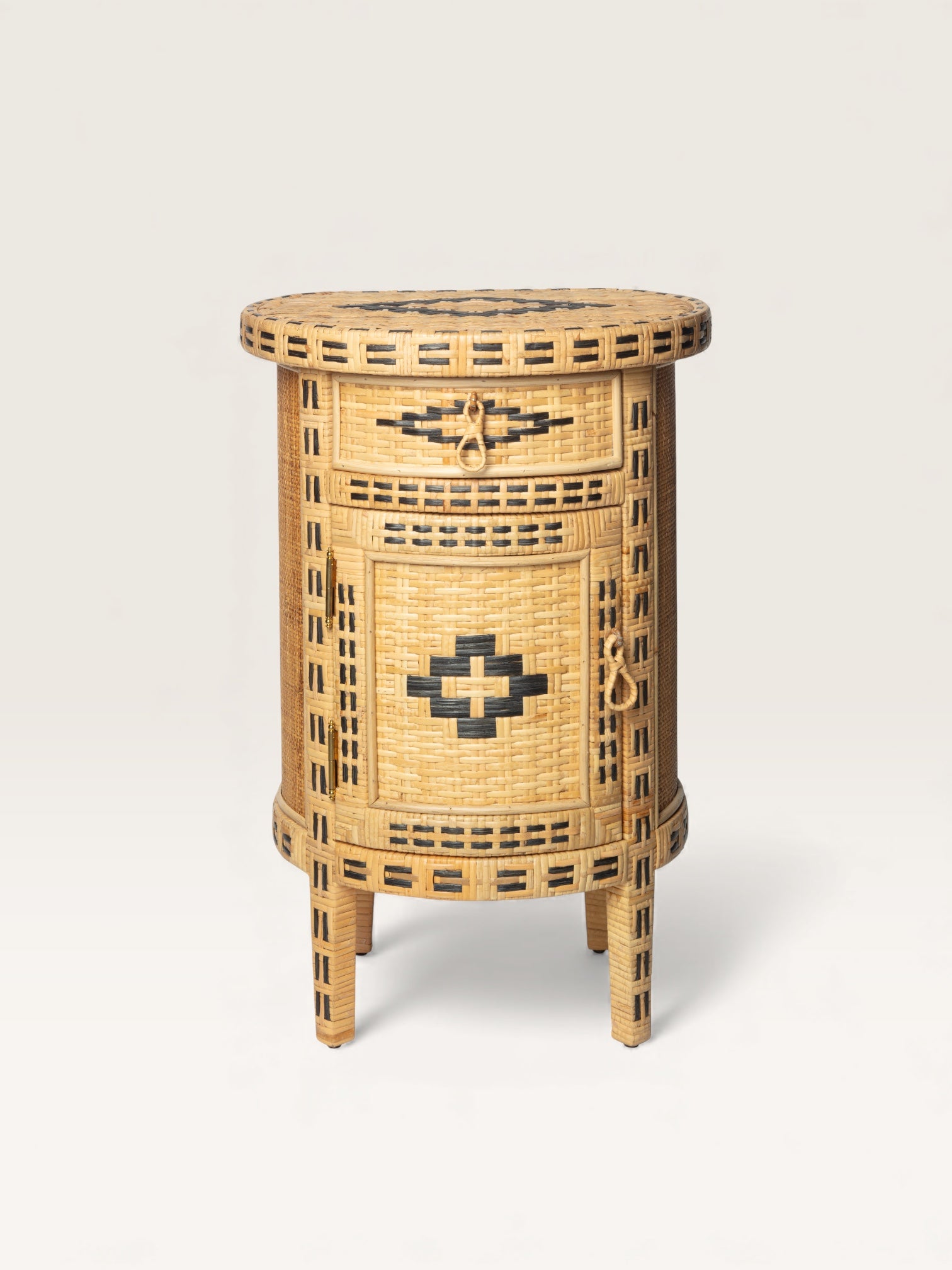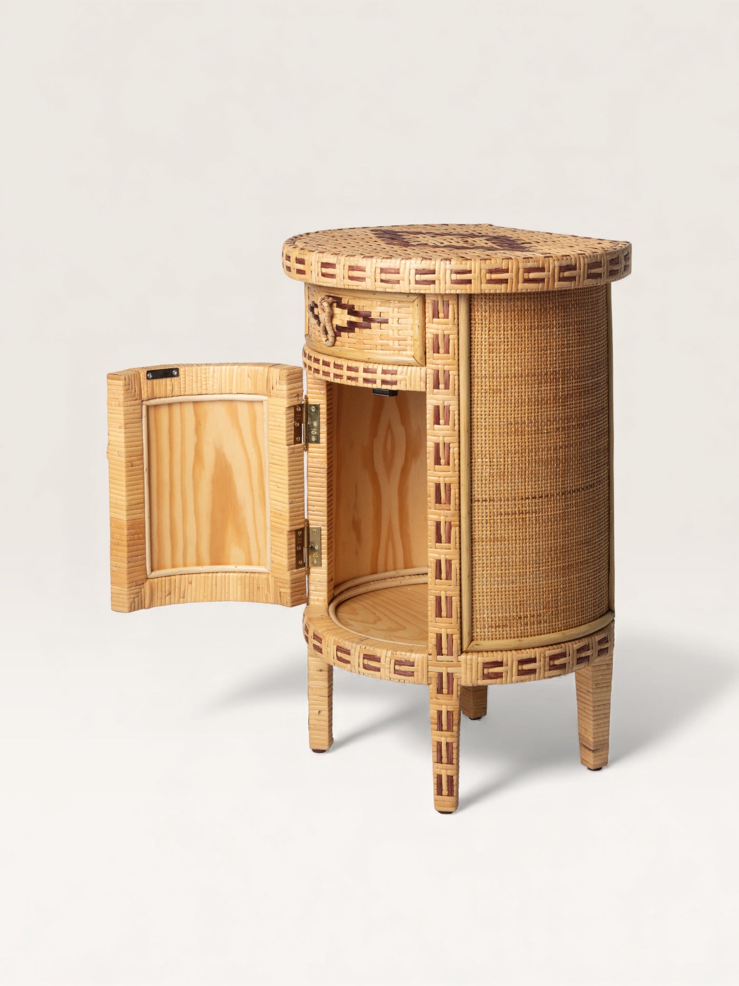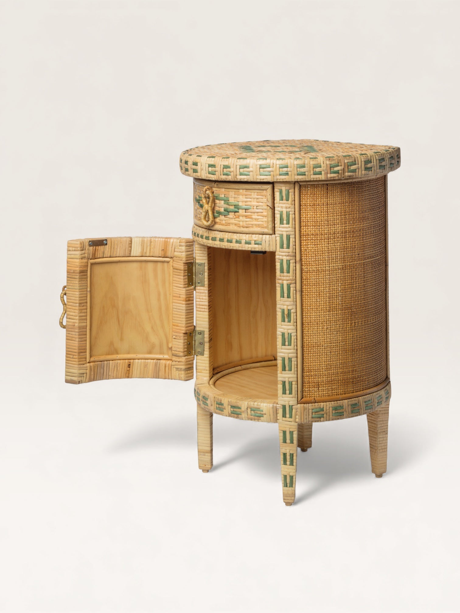 This adorable little side table, crafted from two-tone woven straw, is fully curved at the front and flat at the back. Handmade in Spain, it makes an ideal bedside table. Featuring two sets of storage—a drawer and a cupboard—it helps create a delightfully nomadic atmosphere in an attic bedroom but can also serve as a charming end table in a more traditional living room.