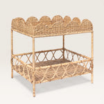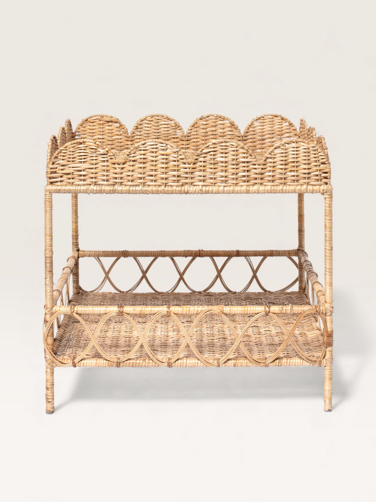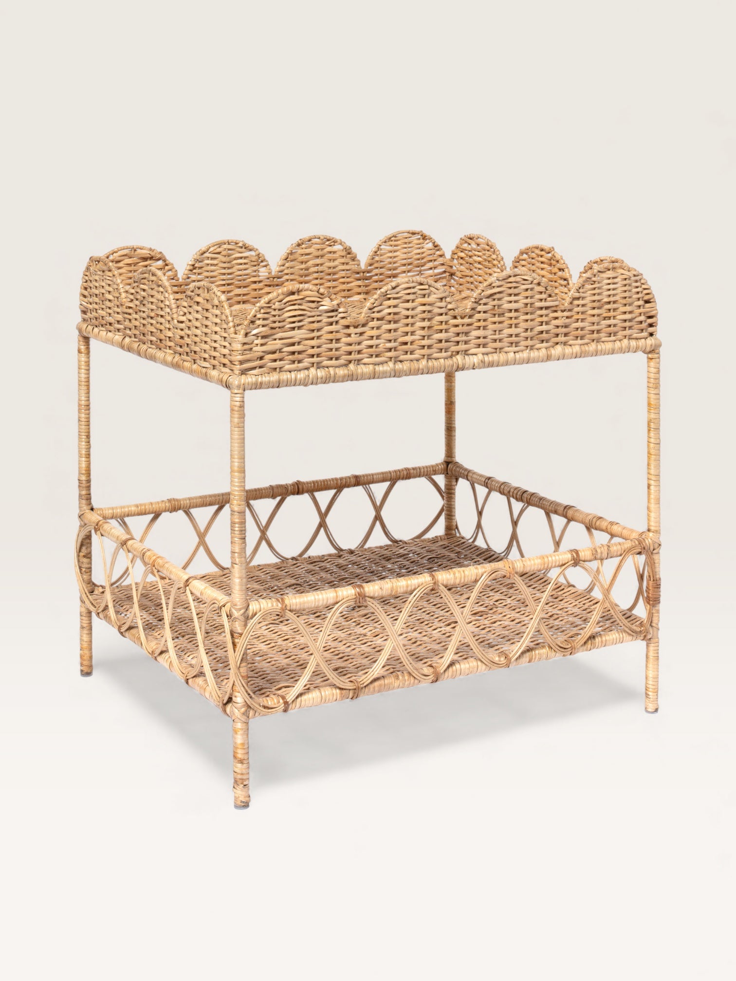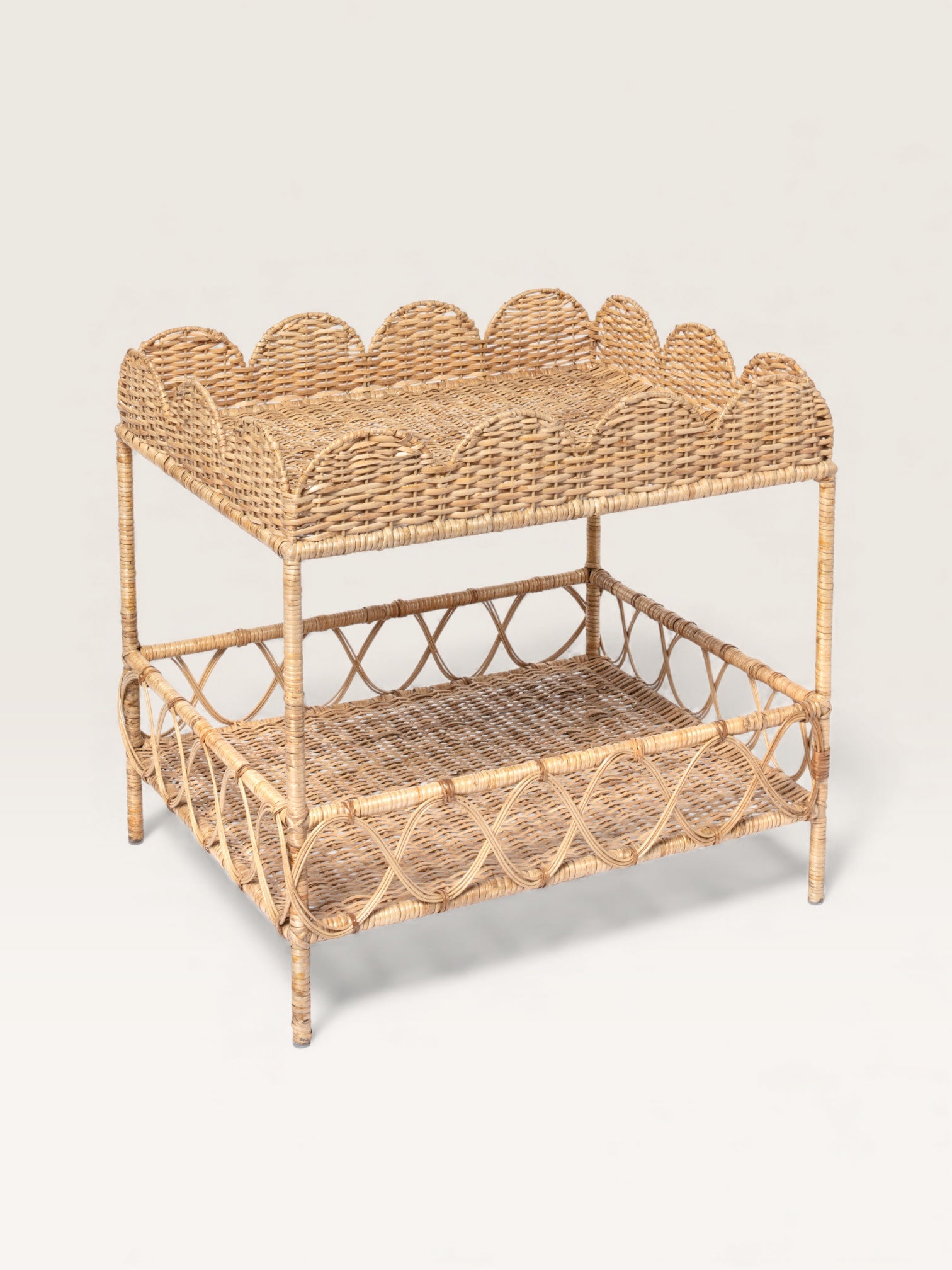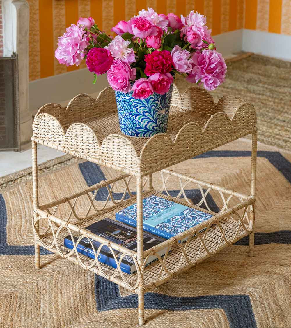 Rattan is a wonderful material because it can be woven to create patterns. On this compact side table, the crocheted weave blends with the scrolls to create a harmonious mix. Rectangular, with two shelves, this small piece of furniture is perfect as an end table in a living room. In a home office, it can hold a printer and some files. It's also the ideal table for the bathroom; placed near a sink, it stylishly accommodates toiletries and other essentials.