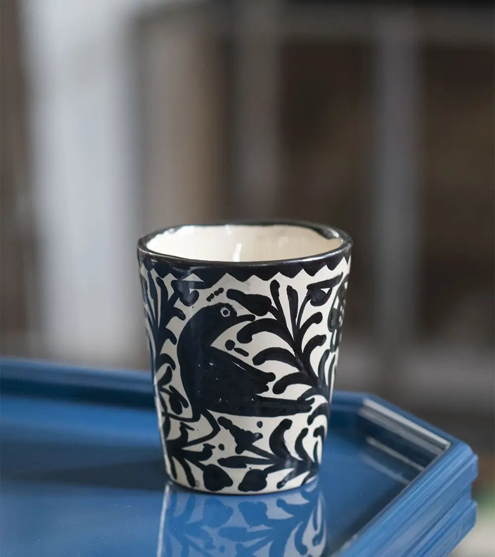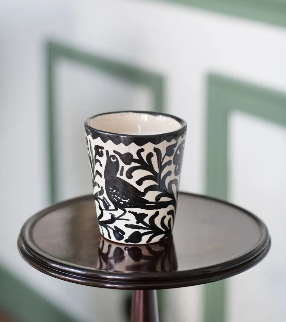 Presented in a glazed ceramic container featuring the iconic Iberian bird motif within a vegetal interlacing, this time in black and white, the Don Pedro candle is a nod to the masculine world. Its enveloping and sophisticated fragrance, blending pepper, myrrh, and patchouli, evokes the elegance of the flannel suits worn by family men in the 1970s; the generation of Pierre Sauvage's father, to whom he thus pays homage.