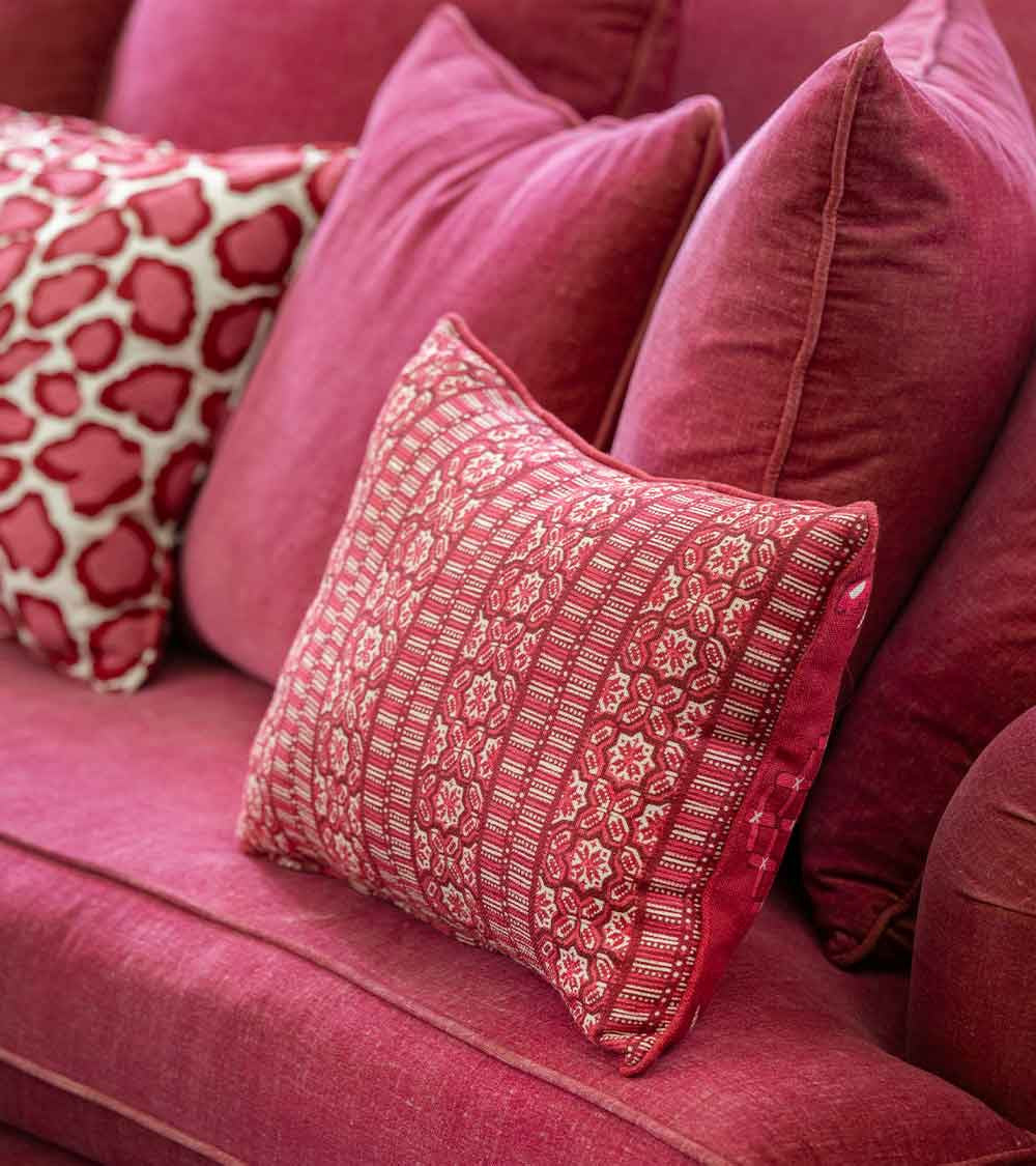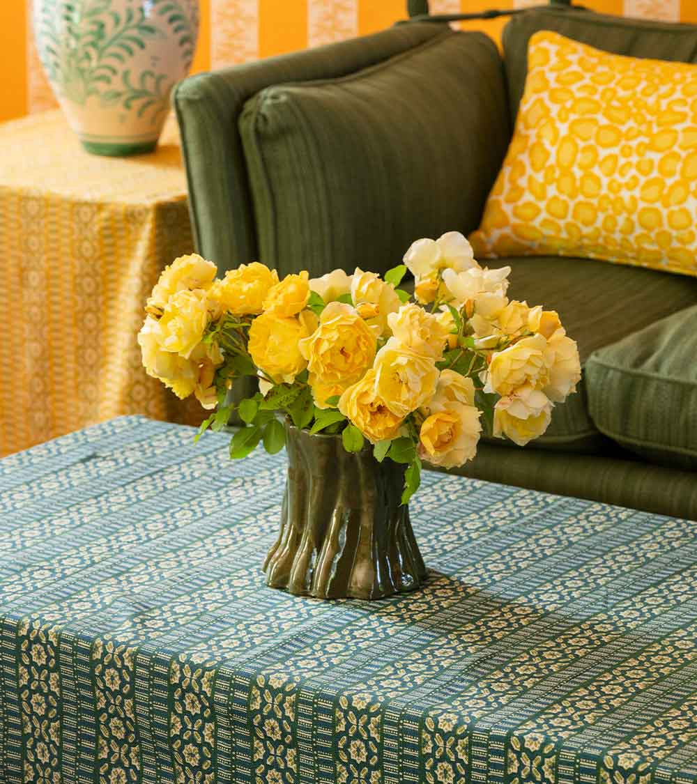 Linen fabric with alternating stripes, blending floral and stylized geometric patterns. The idea, explains Pierre Sauvage, is to draw inspiration from Indian prints to cut it up and make borders, door frames or niches.