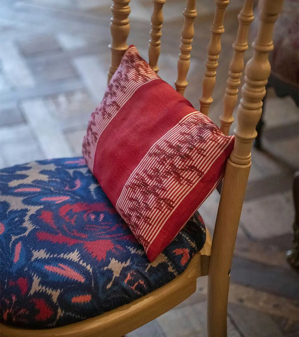 Created using a printing technique on linen in the style of ikat weaving, this stripe layered fine bands, neatly and regularly repeated, with vibrant motifs that convey a kind of contradictory energy. A deceptively classic fabric with a rebellious streak, it lends itself to surprising "mix & match" combinations with the Java, Clover Embroidery, and Ikat Flowers designs, from which it borrows various colors.