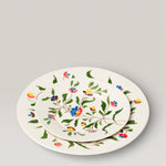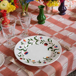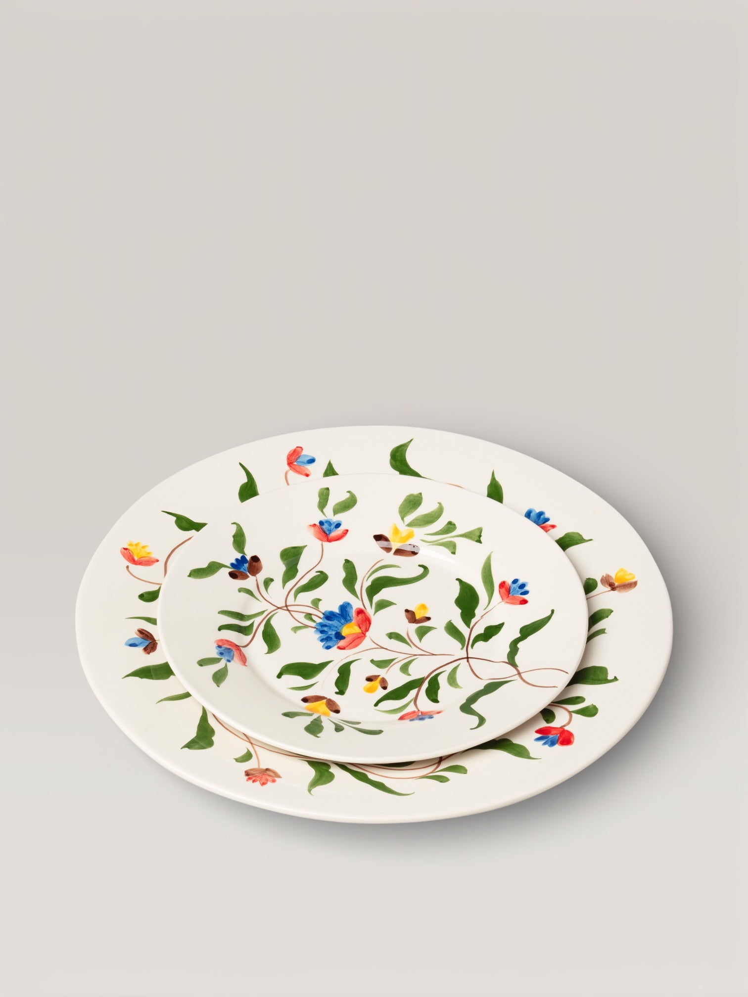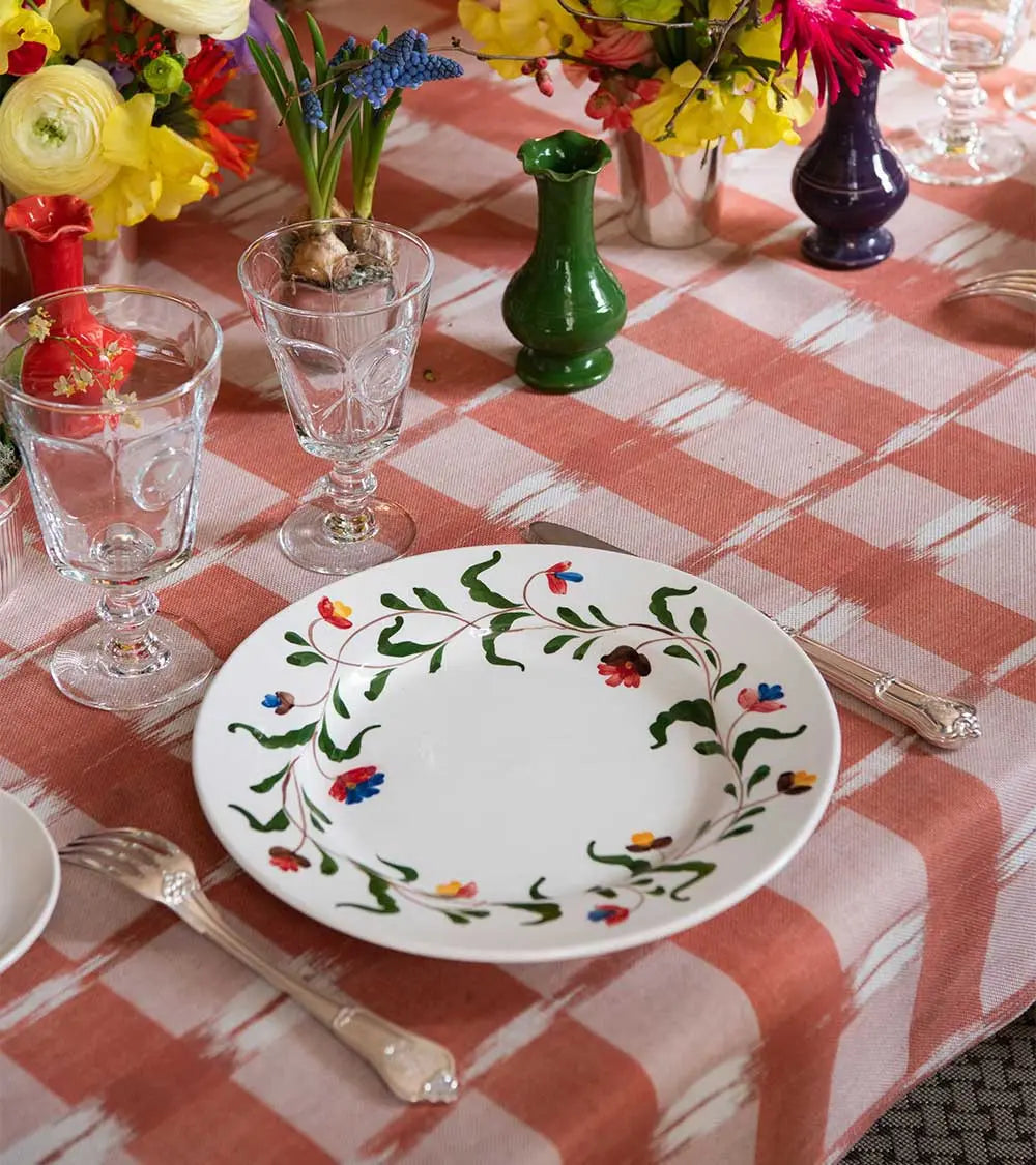 The freshness of hand-painted flowers, arranged in garlands, sprigs, or interlacing patterns, depending on where it's placed—a large plate, a bread plate, or a dessert plate—reveals the delicate brushstrokes and the perfect interplay of bright, cheerful colors. This glazed earthenware dinnerware on a white background works beautifully both in the countryside and in the city. Imagine it on white tablecloths, evoking the simple pleasure of a picnic.