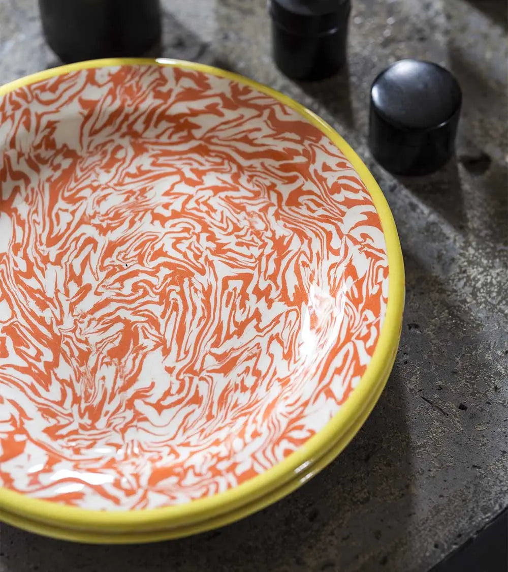Handcrafted in Provence, these classic plates are perfect for serving all kinds of dishes at the table. They're also ideal for the garden, where, placed on a sideboard, they can hold savory tarts and a variety of salads. Casa Lopez reinterprets tradition with this marbled tableware, made from a rare and precious 18th-century technique called "terre mêlée" (mixed clay).