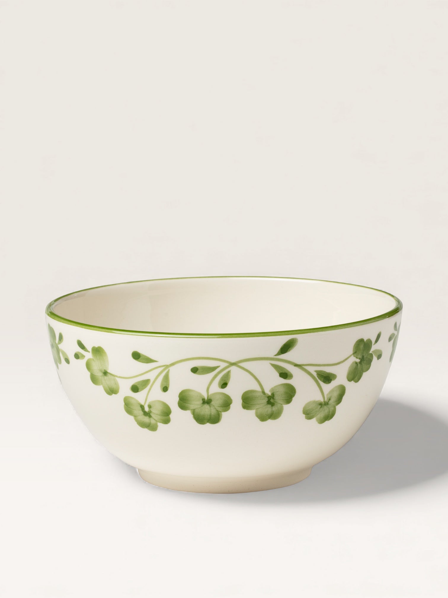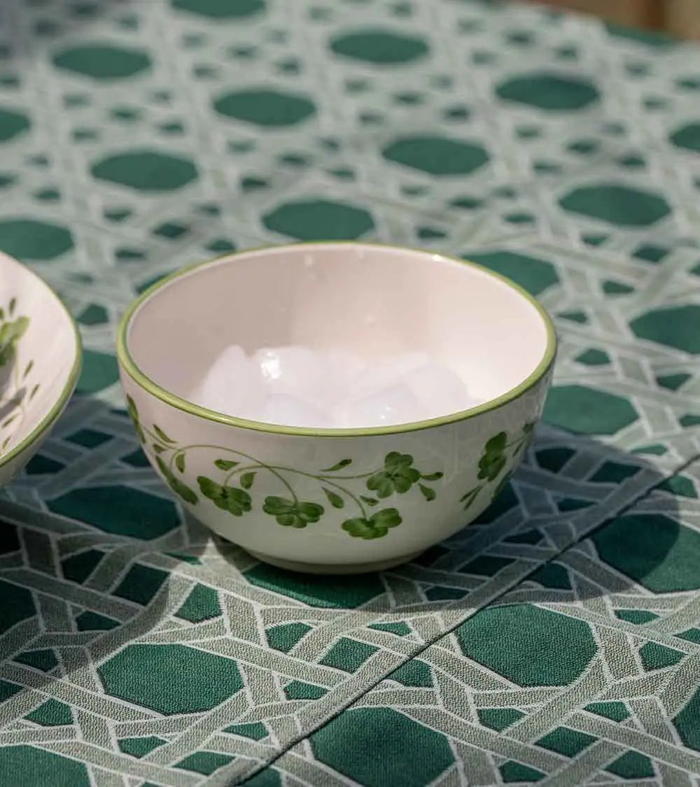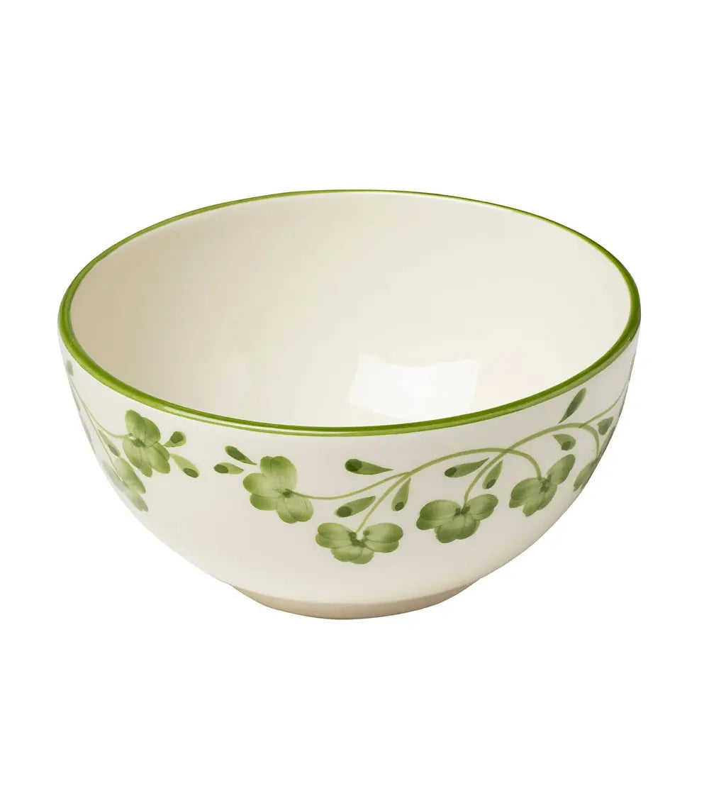 This hand-painted earthenware bowl, decorated with a garland of stylized four-leaf clovers, is part of a lucky charm collection. It's quite versatile, serving multiple purposes: it can be used to serve breakfast cereal as well as evening soup.