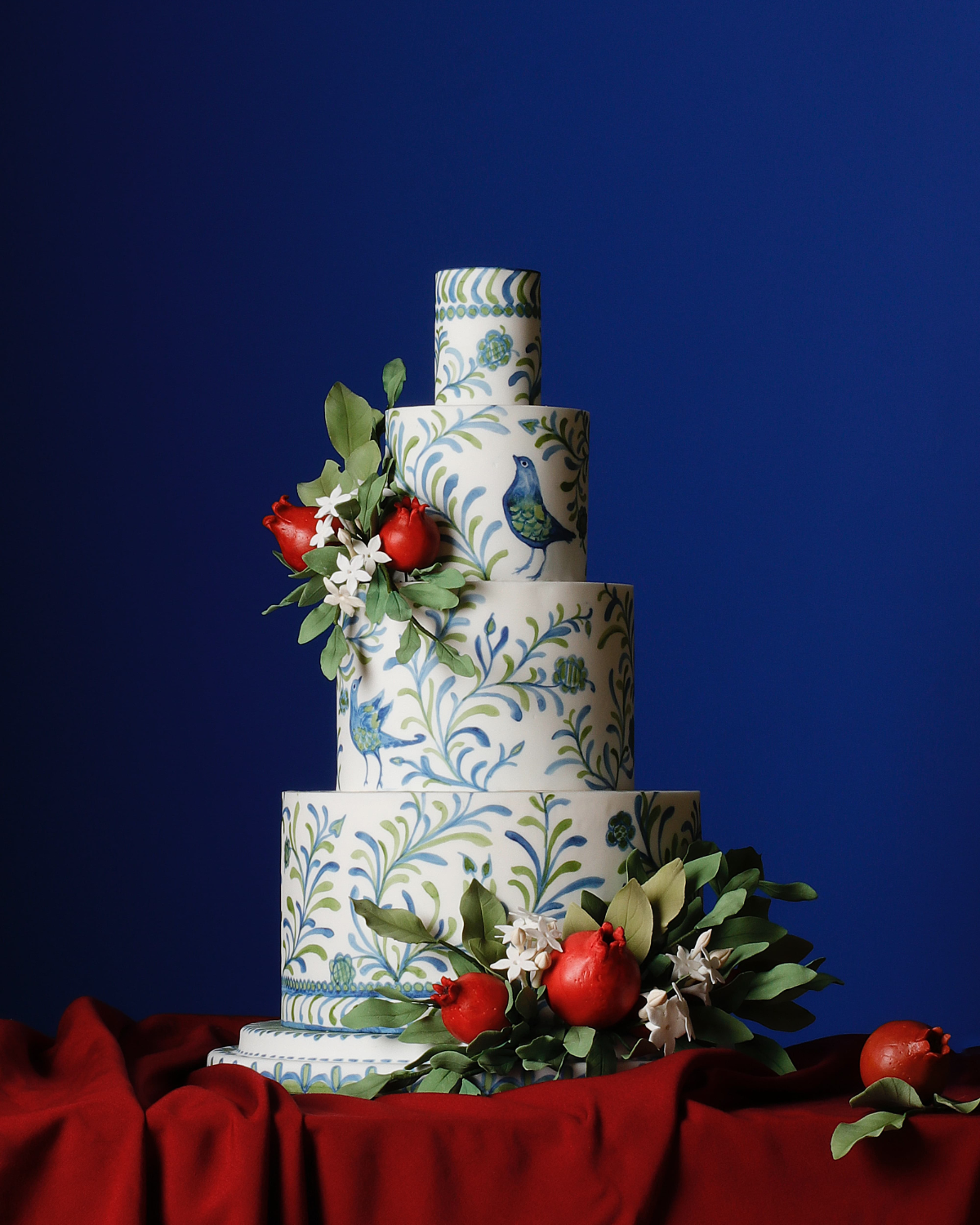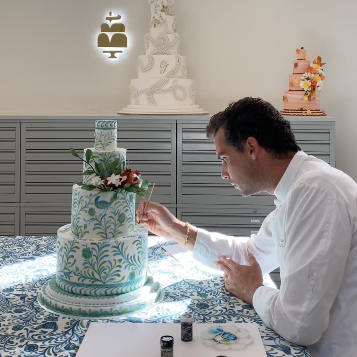 The cake features the house's iconic motif: a bird within a vegetal interlacing, rendered in shades of blue and green, colors dear to the brand. This emblematic design first adorned the house's ceramic tableware before finding its way onto lamp bases, rugs, and other tableware.