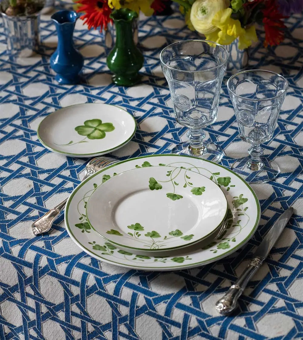 Delicate green or blue leaves, as if plucked from the spot, adorn these white-ground plates with a rim of the same color. Entirely handcrafted in Portugal using traditional methods, the Clover collection is hand-painted. Both charming and timeless, a symbol of renewed good fortune, it includes dinner plates and dessert plates, each featuring a lucky charm at its center. Its enduring theme makes it a must-have for any table. It mixes beautifully with other ceramic pieces and complements all types of table settings. It also makes a wonderful gift.