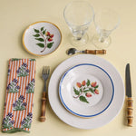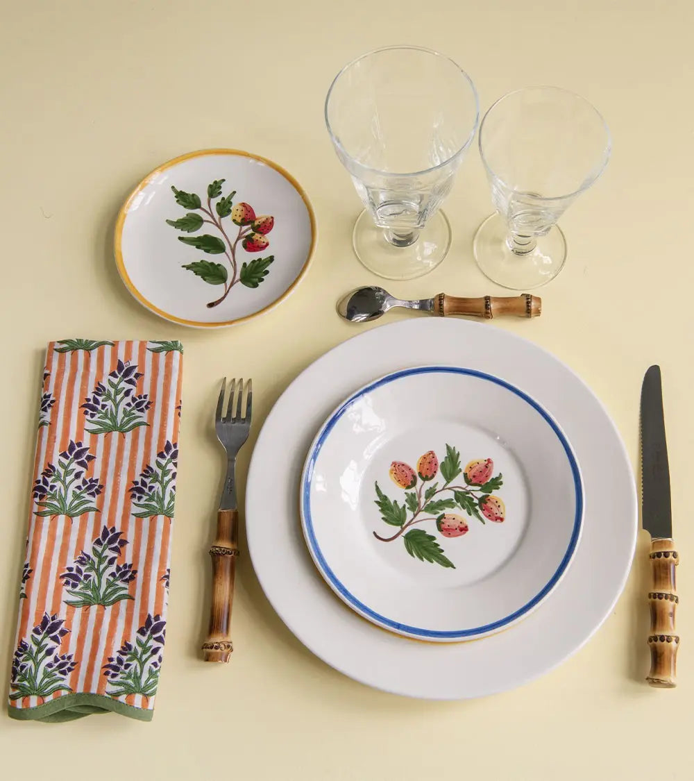 The strawberry, a vibrant red fruit we devour with delight, is transformed here into an appetizing ornamental design. Hand-painted and presented as a branch, it adorns the eponymous dinnerware set. This rustic service, available in three plate sizes, features a yellow or blue line that provides an elegant contrast to the white earthenware. One can easily imagine them gracing large summer tables. And throughout the year, they can be used as dessert plates to evoke memories of warmer days.