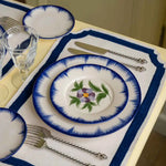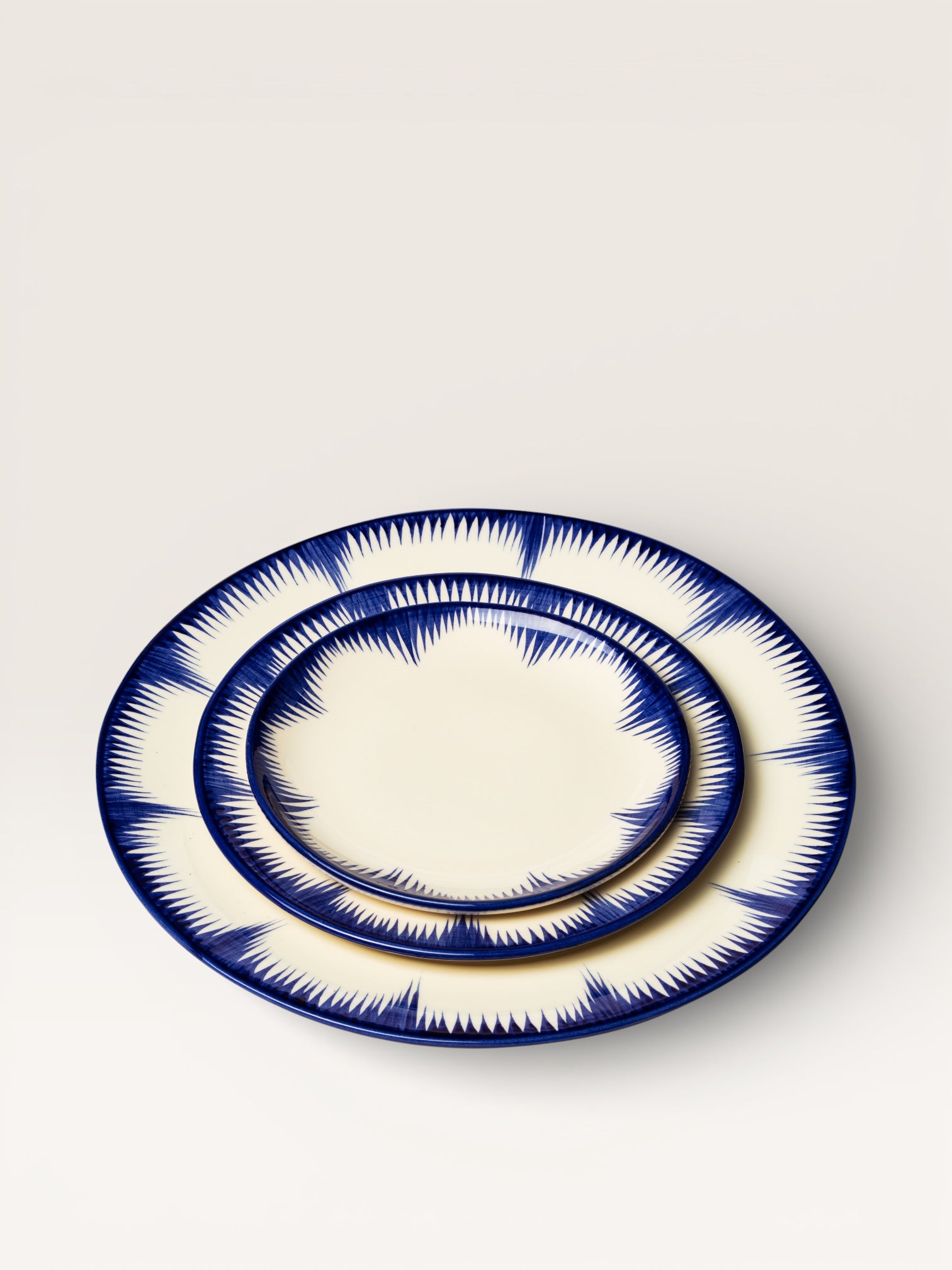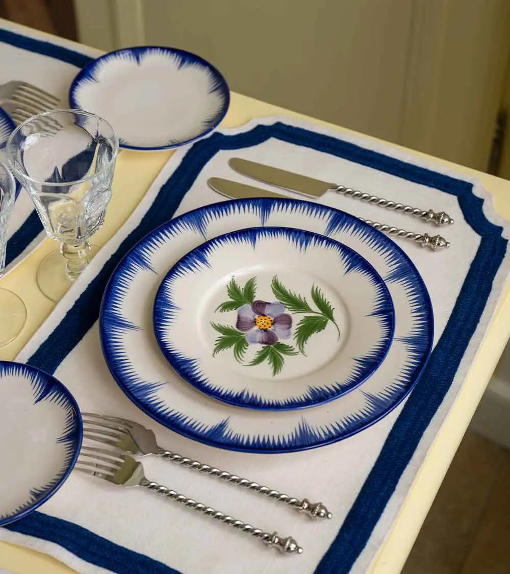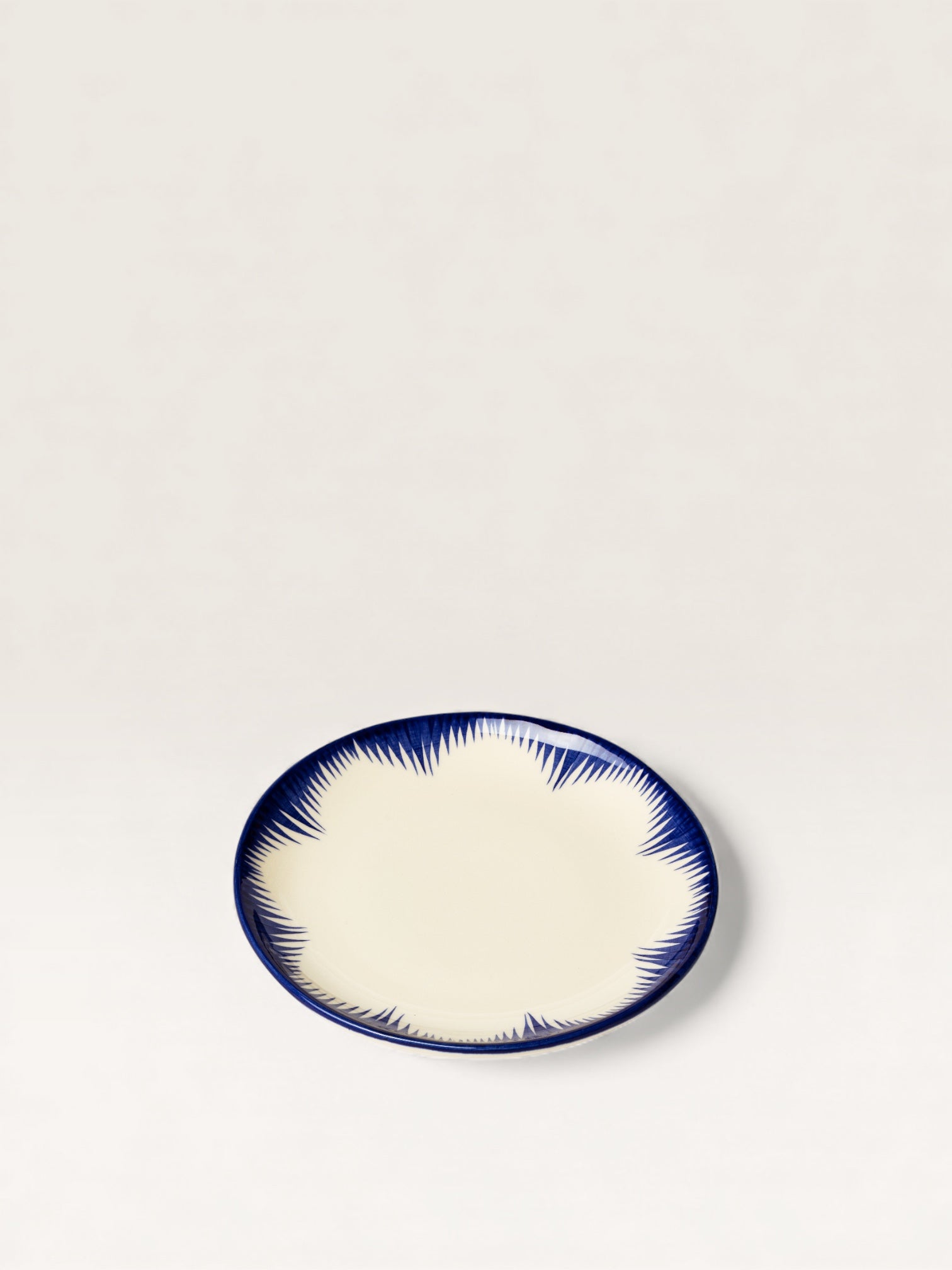 “This simple, fragrant, rugged rosebush almost reminds me of a wildflower.” It is to pay homage to this species, which he particularly cherishes, that Pierre Sauvage designed the Rugosa service. These hand-painted ceramic plates are decorated with a deep blue combed rim, inspired by the famous 19th-century Rousseau earthenware service. Adorned in the center with a delicate rose design—black, blue, or pink—set against a leafy branch, they are available in three sizes: dinner plates, dessert plates, and bread plates. This quintessential family service is easy to use whether dining in the kitchen or the dining room. It pairs well with all kinds of glassware—white, blue, or chosen to match the colors of roses. And it marks the arrival of a new flower in the Casa Lopez collections.