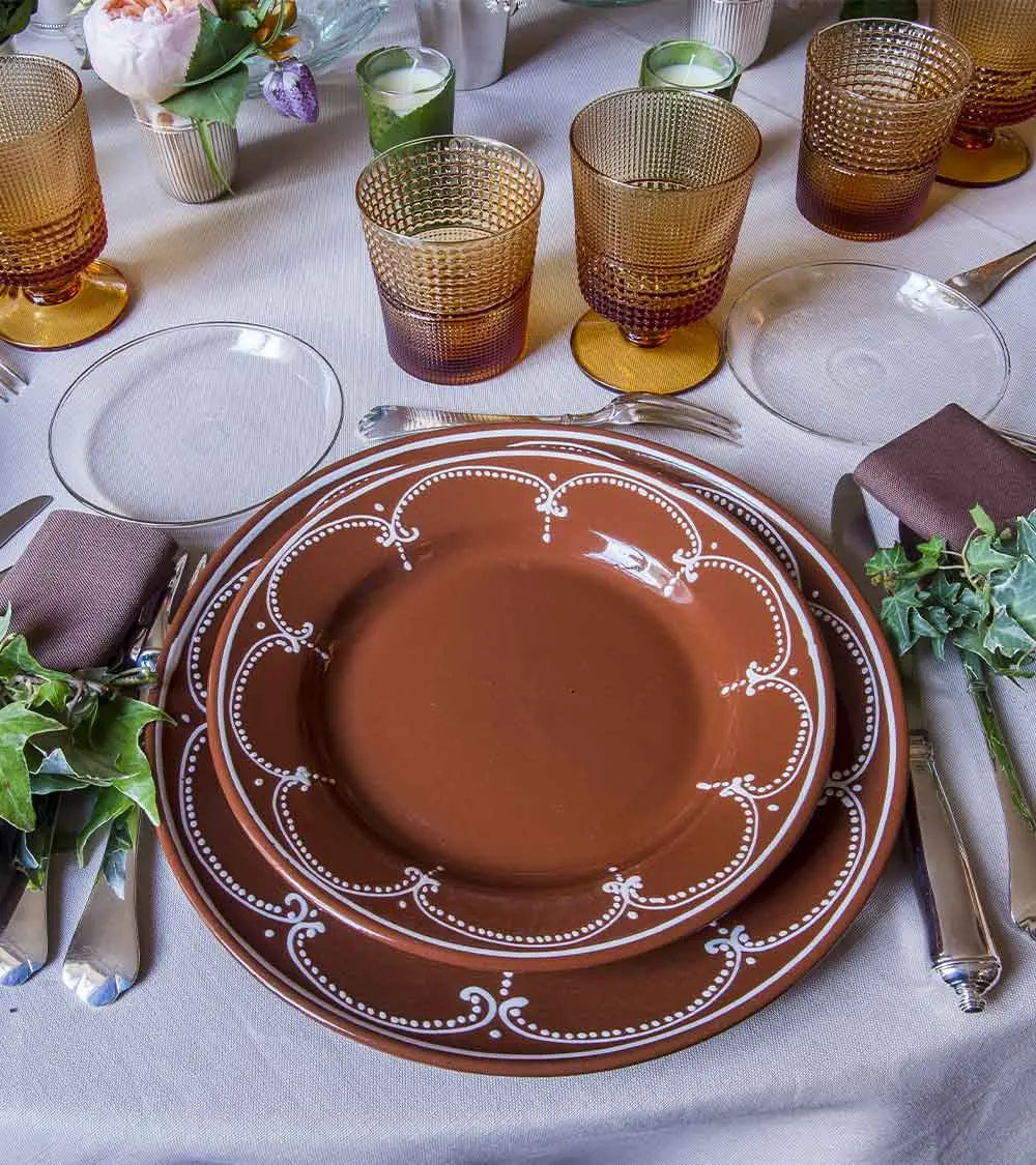 This exclusive tableware set, crafted from hand-painted brown glazed earthenware with delicate friezes of perfect white dots, is entirely made in Portugal using a traditional firing technique. Comprising dinner plates, soup plates, and casseroles, its unique feature is its oven-to-table design. Particularly charming in the countryside, it allows you to prepare hot, simmered, or braised dishes, ready to serve.