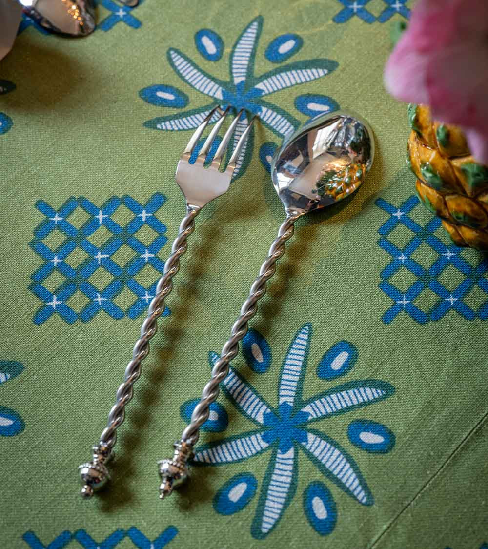 This first series of tinplate cutlery, specially designed by Pierre Sauvage to complement the Casa Lopez tableware, embodies the very spirit of the brand: a subtle yet undeniable blend of simplicity and sophistication. Featuring handles reminiscent of twisted silver spaghetti, these pieces, designed to be neither too heavy nor too light, ensure a comfortable grip for diners. Exclusively available in silver, they come in several versions: teaspoons, dessert cutlery, and dinner cutlery. Apart from the salad and serving pieces, the spoons, forks, and knives in this set are sold individually and are, of course, dishwasher safe. Already a classic, it graces tables both near and far, accompanying all four seasons.
