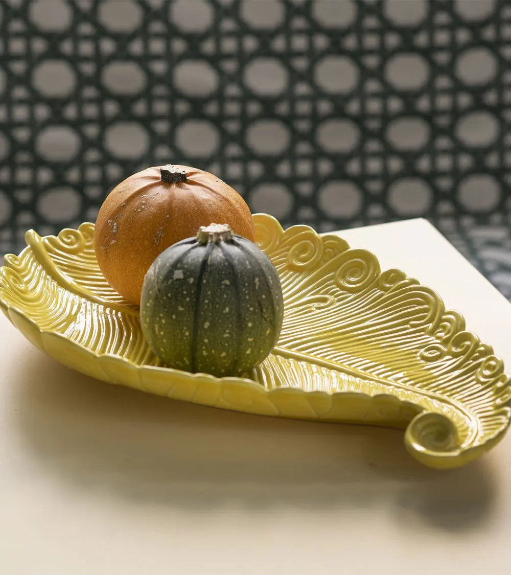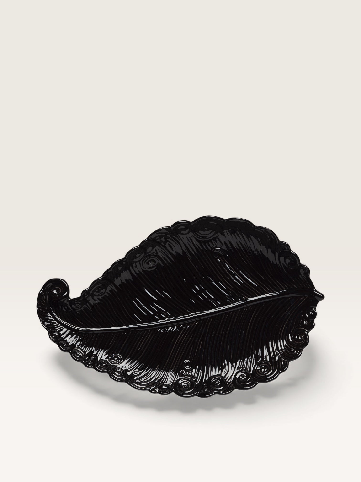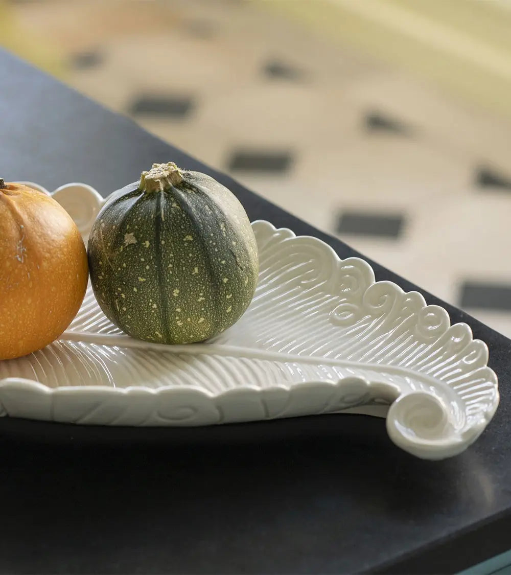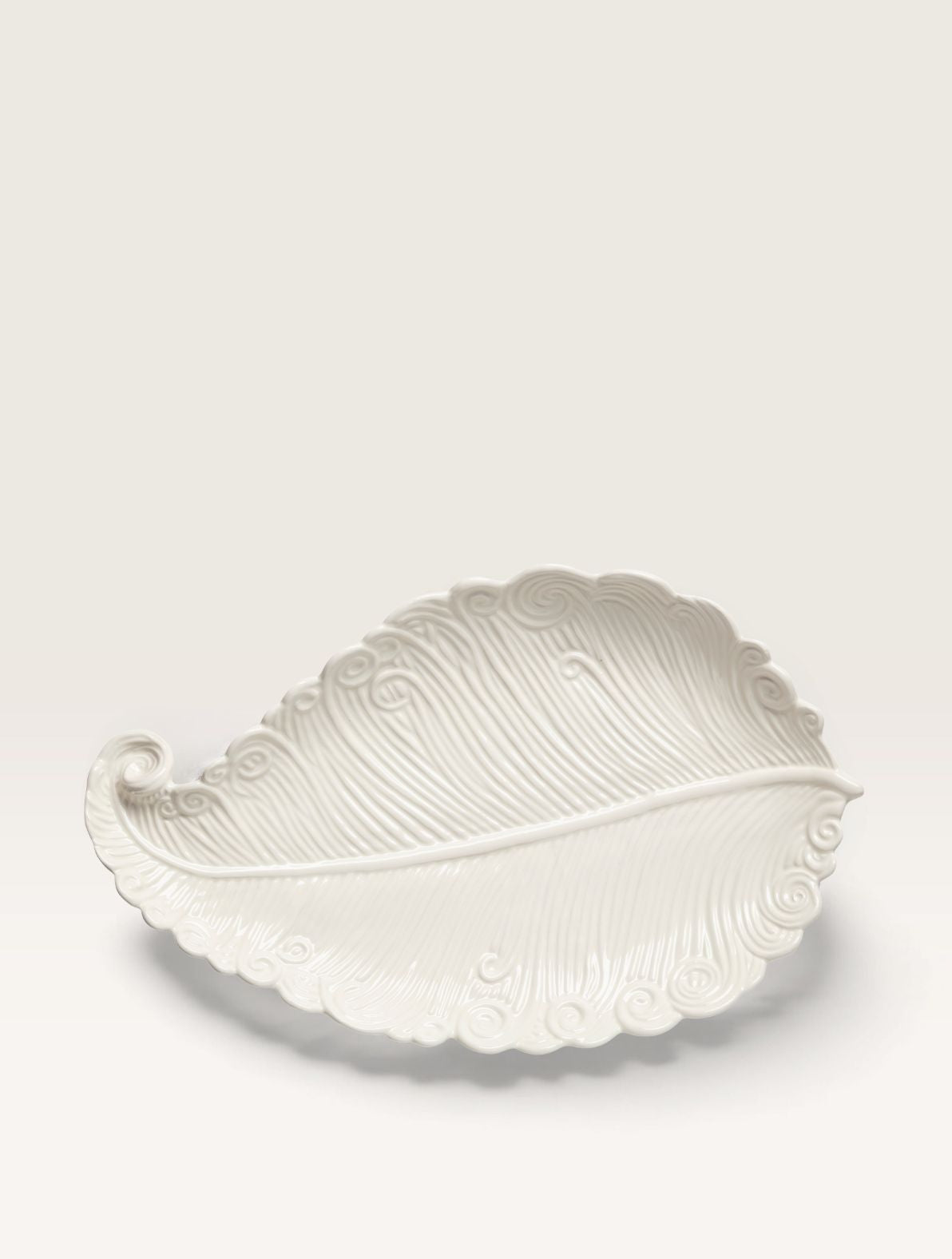 This shaped dish, adorned with light and delicate feathers, is adorned with vibrant colors and its translucent ribbed cushion holds hors d'oeuvres, pretty salads, or a few dried fruits. It can also serve as a catch-all tray and fit neatly in a bathroom, bedroom, or on a desk.