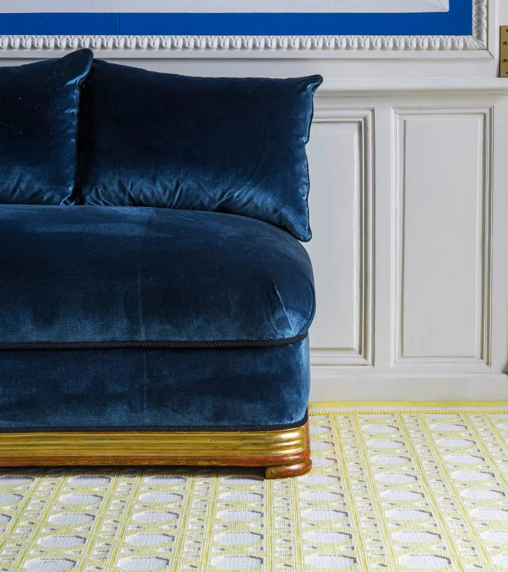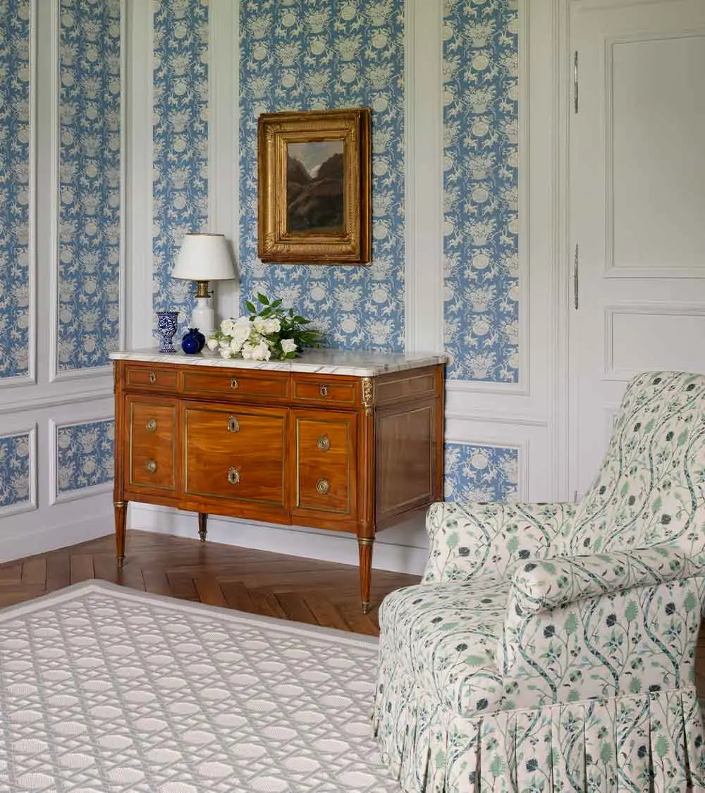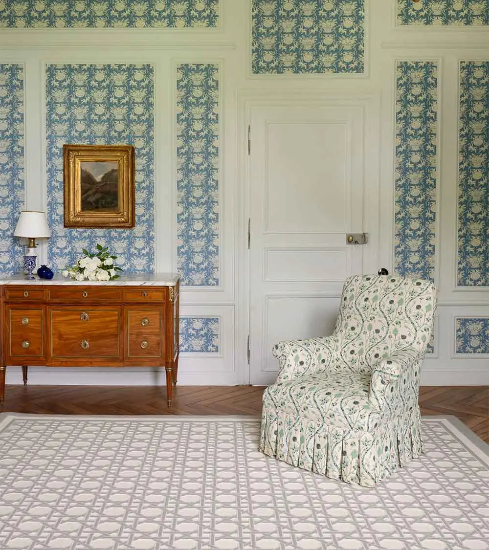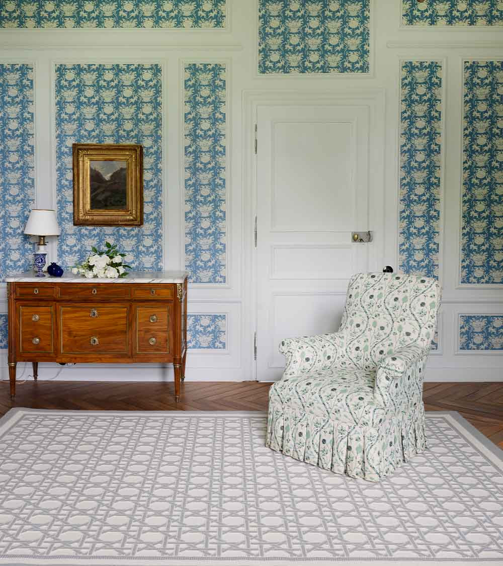 This rug features a cane pattern inspired by the traditional rattan weaving technique used for Regency chairs. Available in beige and white, sky blue and white, yellow and white, pink and white, and grey and white, its delicate, subtly textured surface makes it suitable for both living rooms and bedrooms.