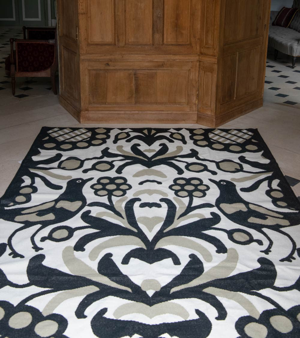When Casa Lopez's iconic motif, the bird hidden in a vegetal interlacing, is found on a hand-woven wool rug, the effect is maximal.