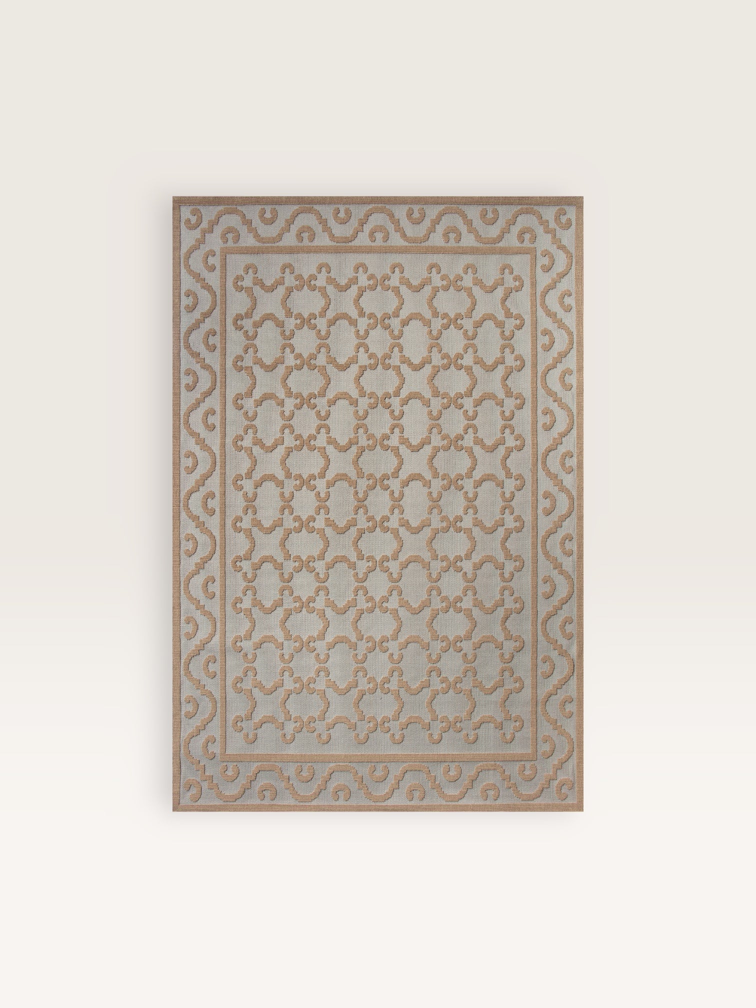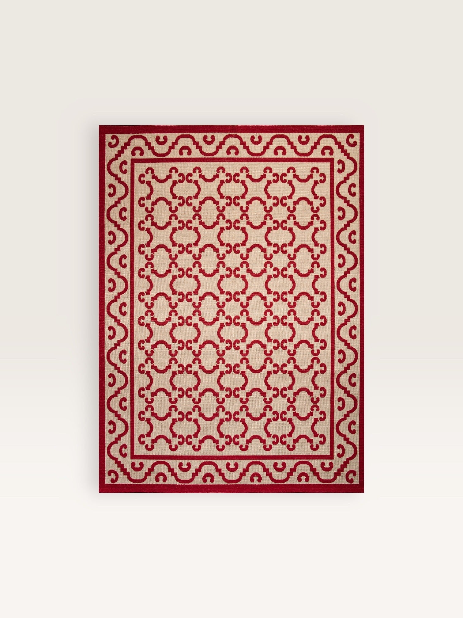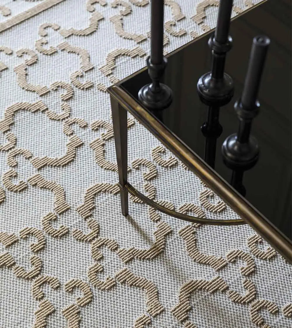 It's a metalwork motif that inspires the design of this wool and jute rug, which comes in three sizes and several colors: blue and beige, red and beige, with a decidedly classic feel.