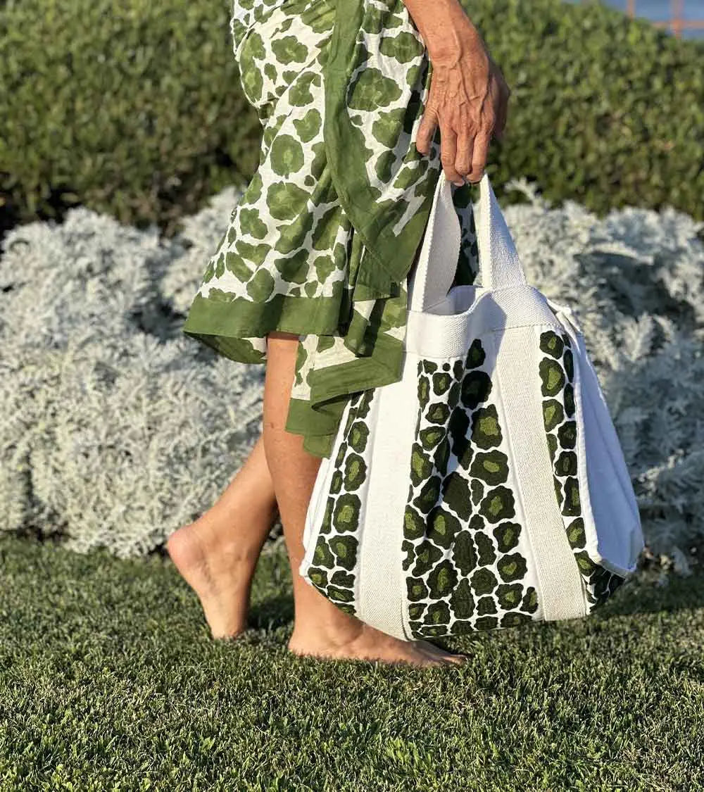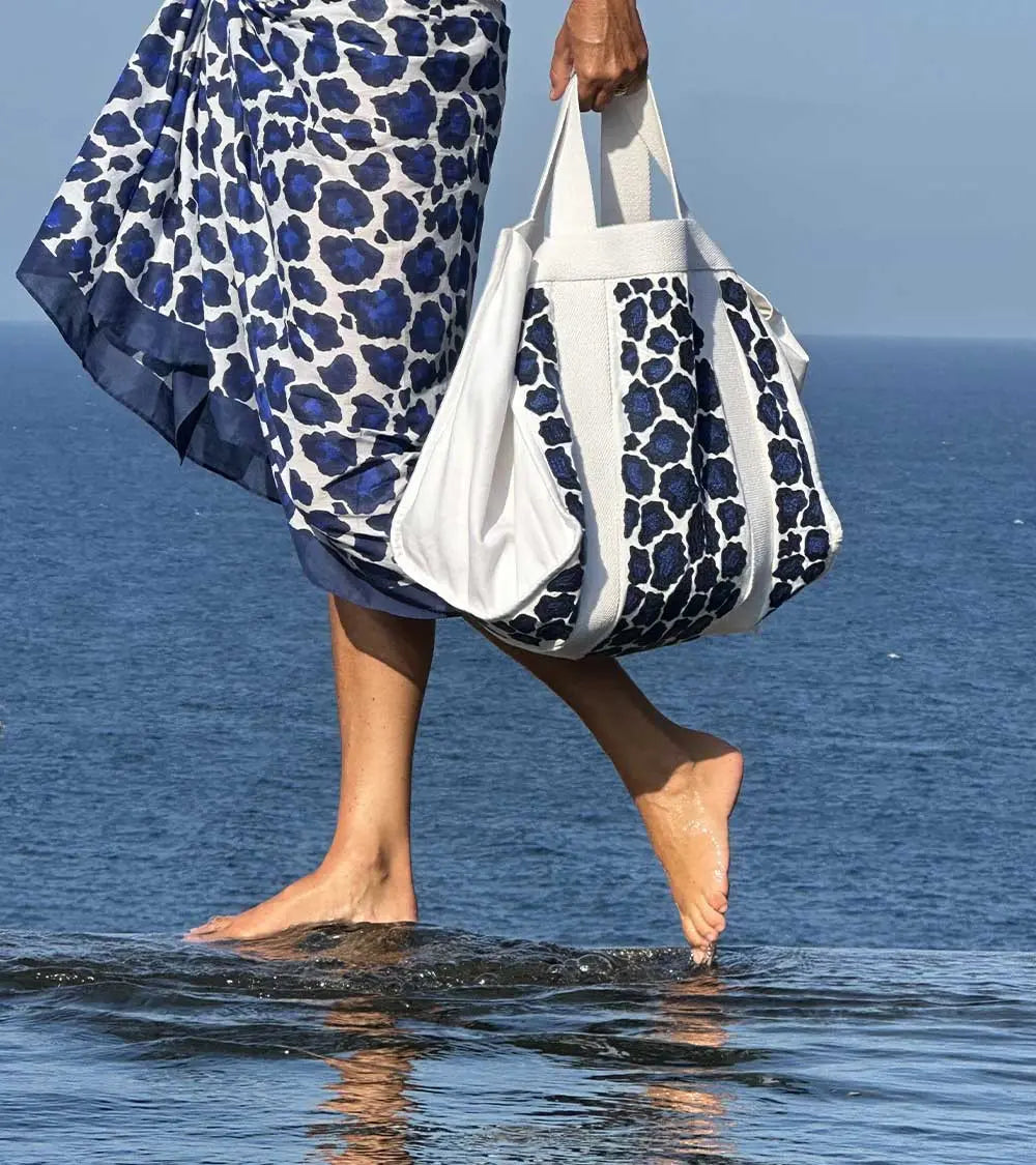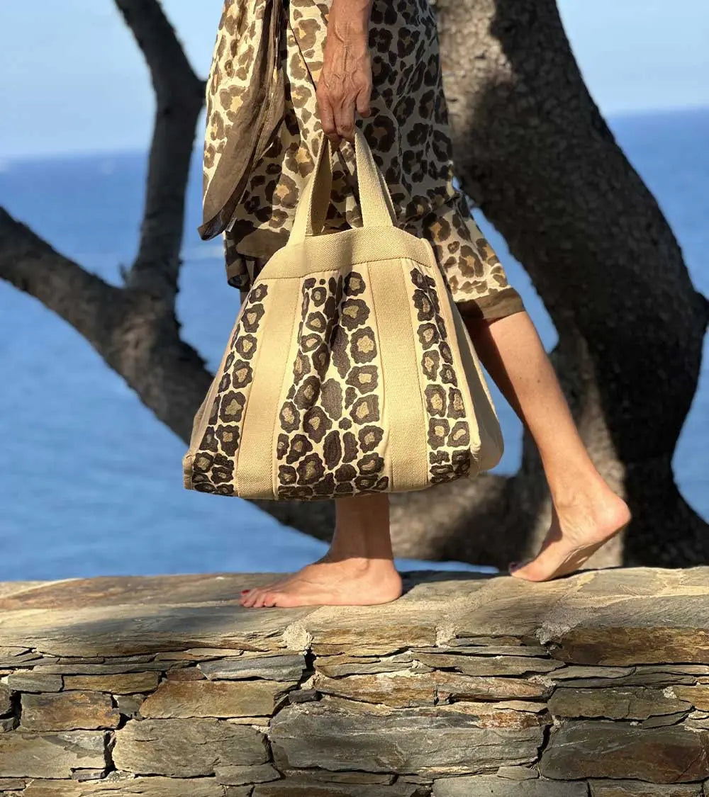 Featuring a leopard print available in four color variations—blue, green, brown, and yellow—this stylishly spotted tote bag is perfect for summer days at the beach, for carrying groceries from the market, or even around town where it complements any outfit. It can also be used to carry documents. Give it as a gift or treat yourself, with or without the matching sarong. An essential accessory designed to roar with delight!