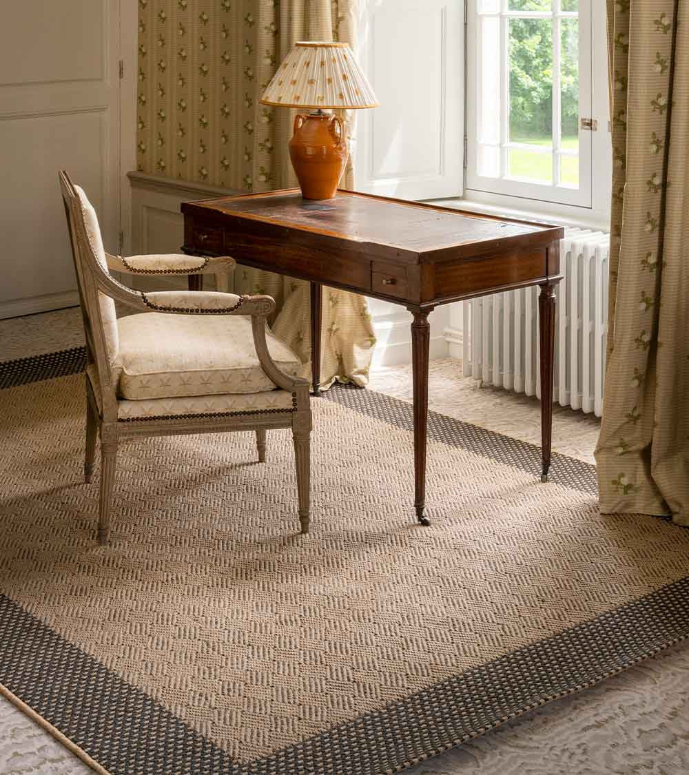 Ce tapis bicolore, en jute, imaginé dans différentes associations de couleurs - blanc/naturel ; rouge/naturel ; brun/naturel - est fabriqué de manière mécanique. Disponible en 4 ou 5 tailles, il est ultra sobre avec son motif ton sur ton central et son pourtour pointillé et par conséquent facile à placer dans tous types d’intérieur.